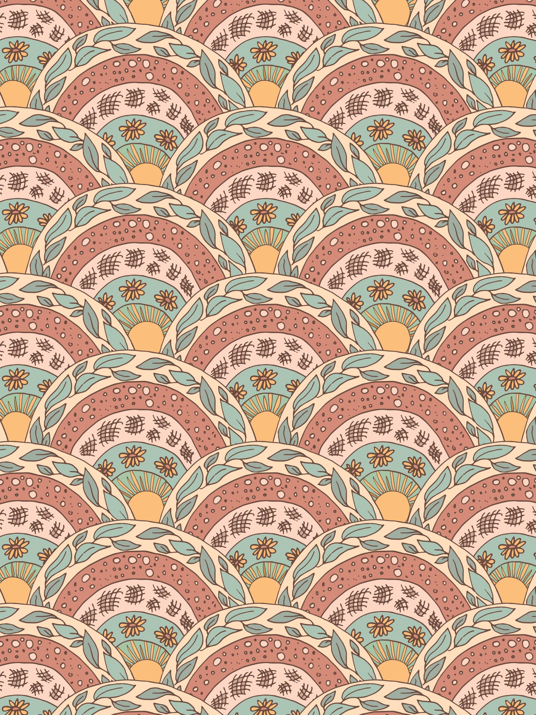 Bohemian sunburst flowers arranged in a repeating, earthy-toned design.