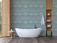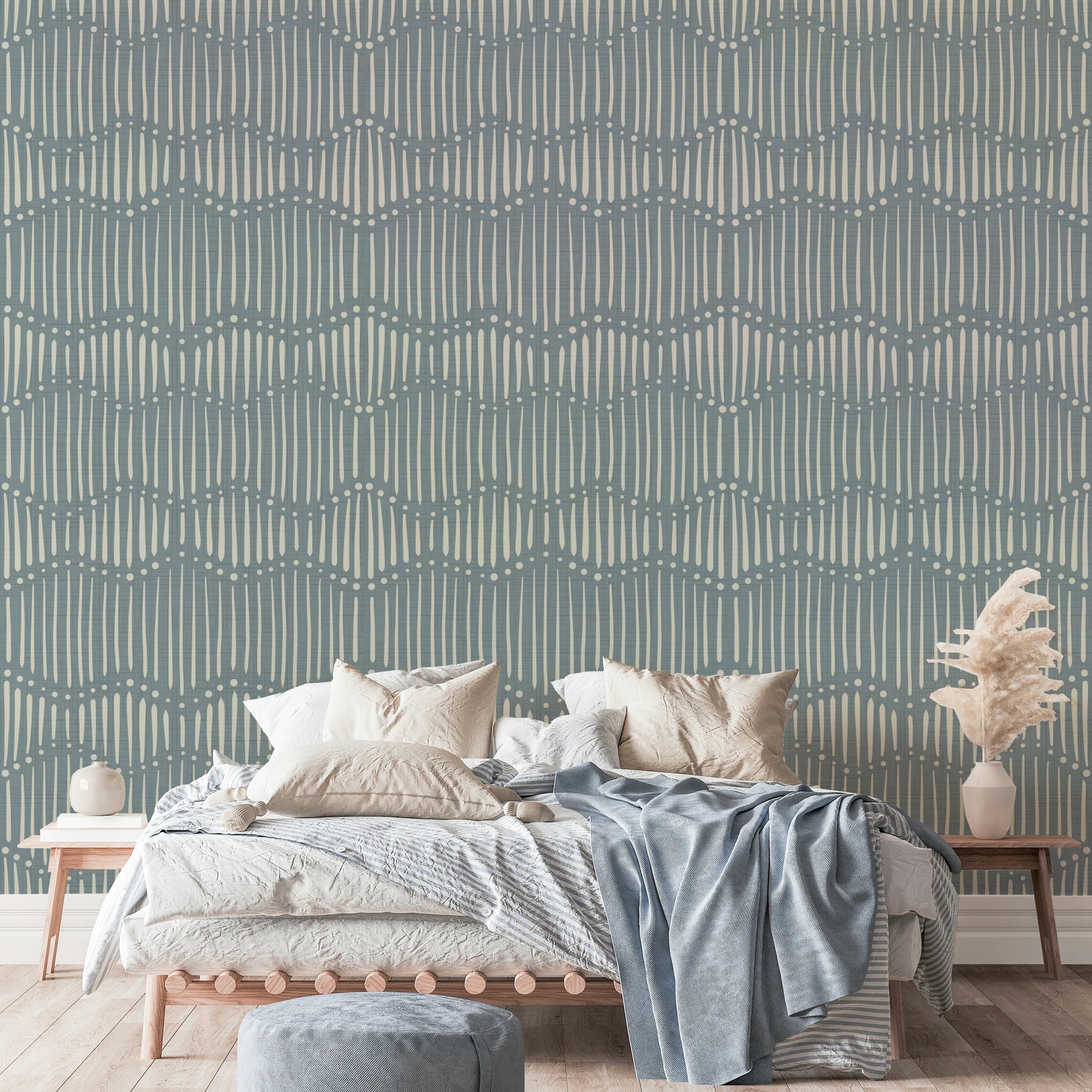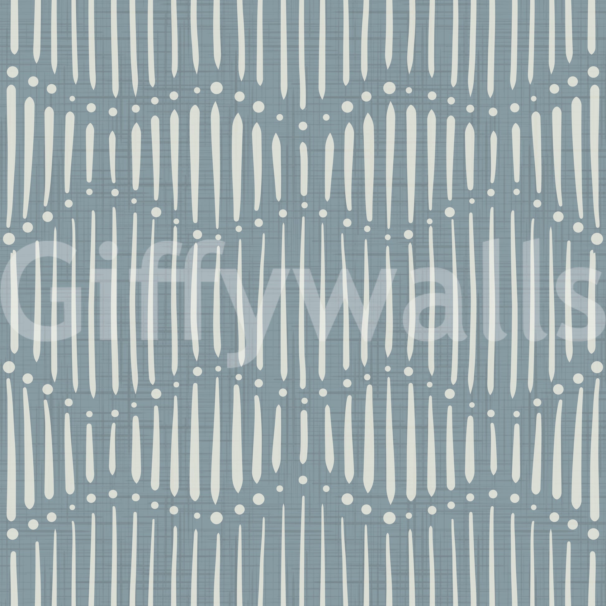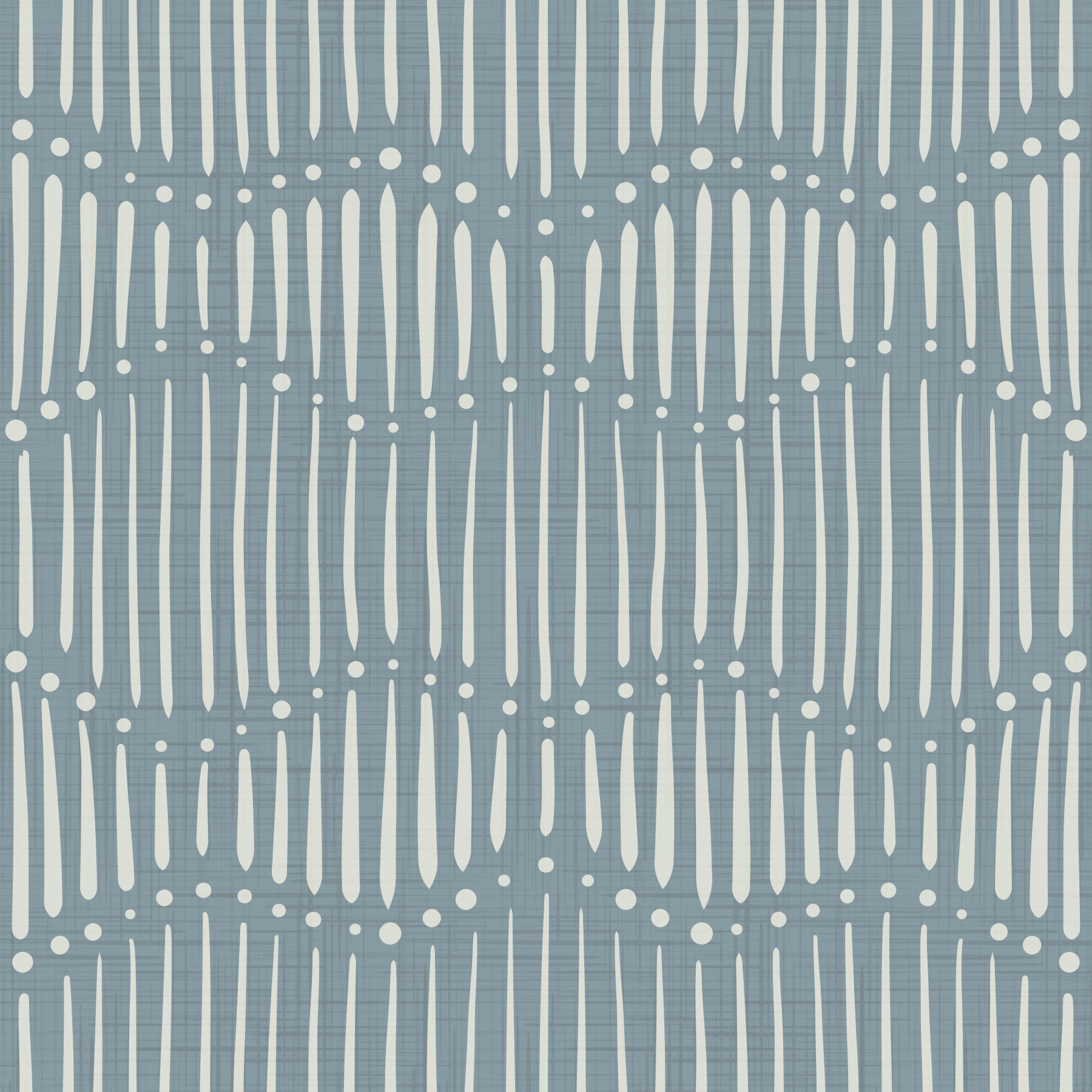 Drift away on a tide of bohemian charm with "Boho Waves On Arona Canvas". This captivating wallpaper evokes the free-spirited essence of the boho aesthetic, presented on a textured 'Arona' canvas background. Pale ivory vertical strokes, suggestive of gentle waves or stylized reeds, dance rhythmically against a serene, muted blue backdrop. Scattered clusters of delicate dots add a playful, whimsical touch, enhancing the overall organic feel. The subtle canvas texture introduces a tactile depth to the design, creating a sense of warmth and authenticity. "Boho Waves On Arona Canvas" is perfect for creating a relaxed and inviting atmosphere in any room. Embrace the laid-back luxury of bohemian style and transform your space into a haven of tranquility with this unique wallpaper.