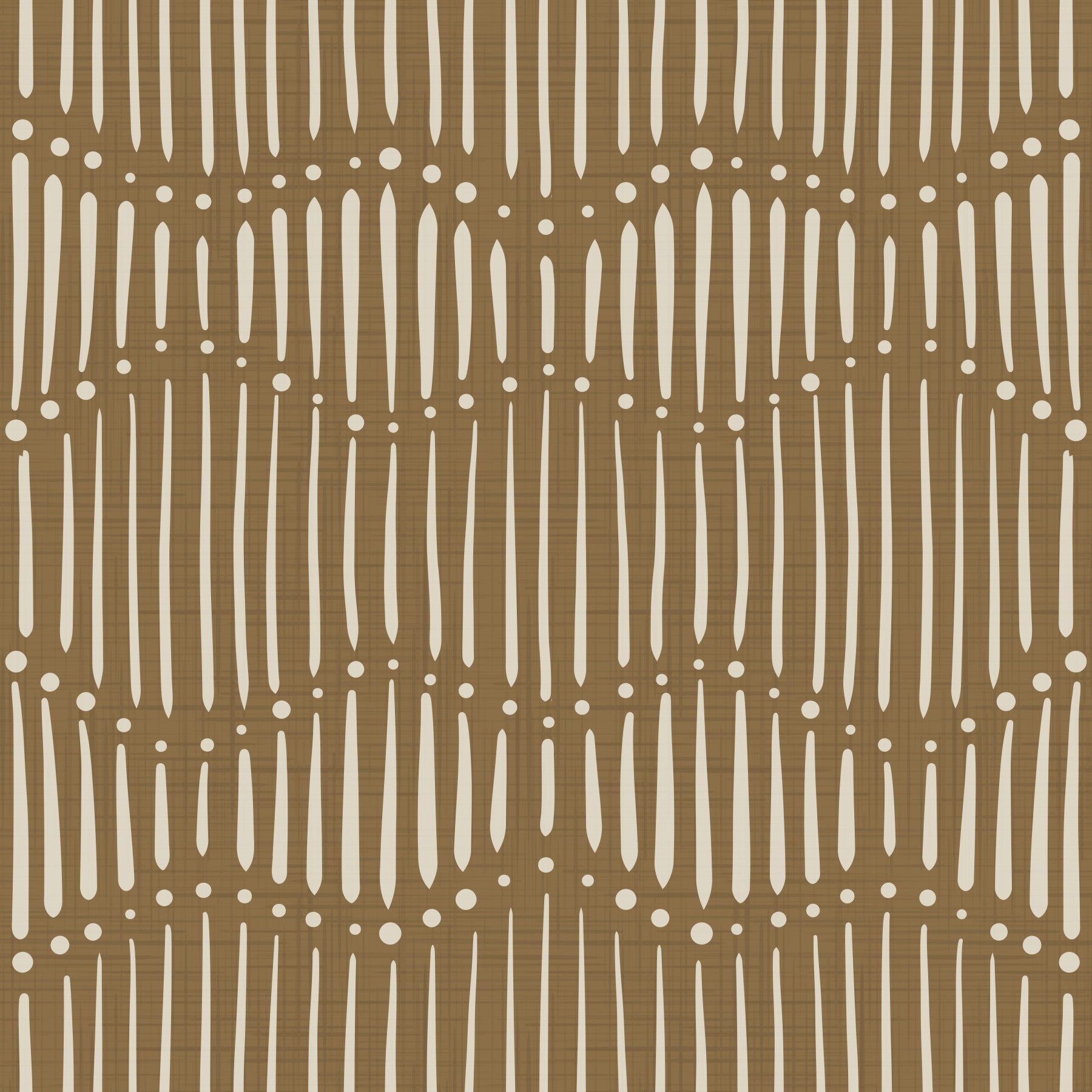 Immerse yourself in the subtle allure of Boho Waves On Dull Gold Canvas. This wallpaper captures the essence of bohemian chic with its rhythmic pattern reminiscent of gentle waves rippling across a textured, gold-toned canvas. Elongated, organic shapes dance vertically, interspersed with playful dots that evoke a sense of carefree movement. The muted color palette of earthy browns and soft creams creates a calming and sophisticated aesthetic, perfect for adding warmth and visual interest to any space. The subtle texture of the 'canvas' adds depth and realism, making it feel as though you're truly experiencing an artistic creation. Let this design transport you to a serene, sun-drenched landscape with its understated elegance and timeless appeal. Ideal for those seeking a touch of bohemian spirit with a refined and modern twist.
