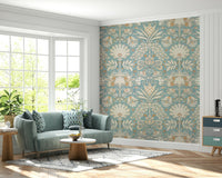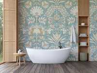Classic botanic wallpaper with soft aqua accents