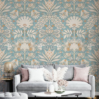 Botanic Damask Cream Aqua Blue Wallpaper in a lounge