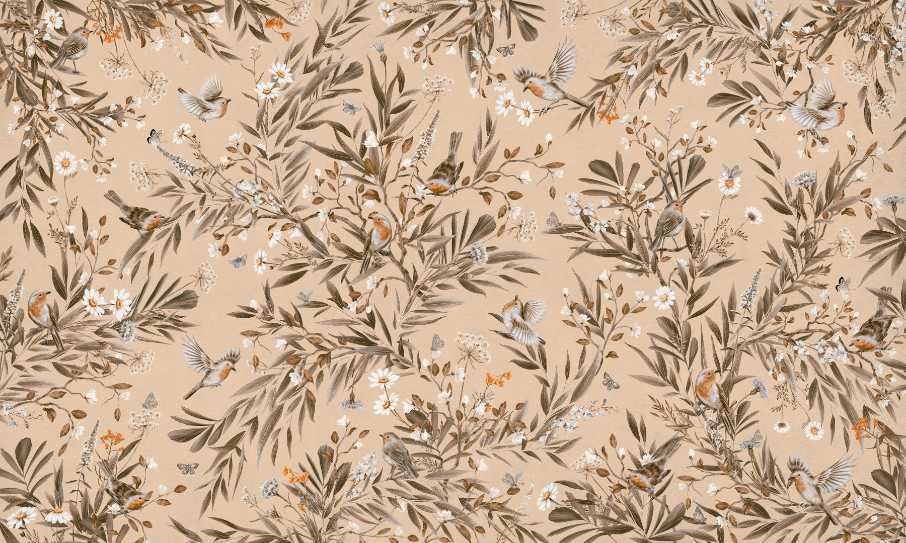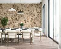 Transform your walls with this peaceful wallpaper for walls. The charming scene features delicate birds amid foliage and blooms, set against a soft background. The detailed design and neutral color tones will add a quiet charm to your space. Ideal for bedrooms, hallways, living rooms, and dining areas, it complements various interior styles, from modern to traditional. Note the intricate botanical details and subtle hues. Imagine this in your nursery! This wallpaper brings the serenity of nature into your home.