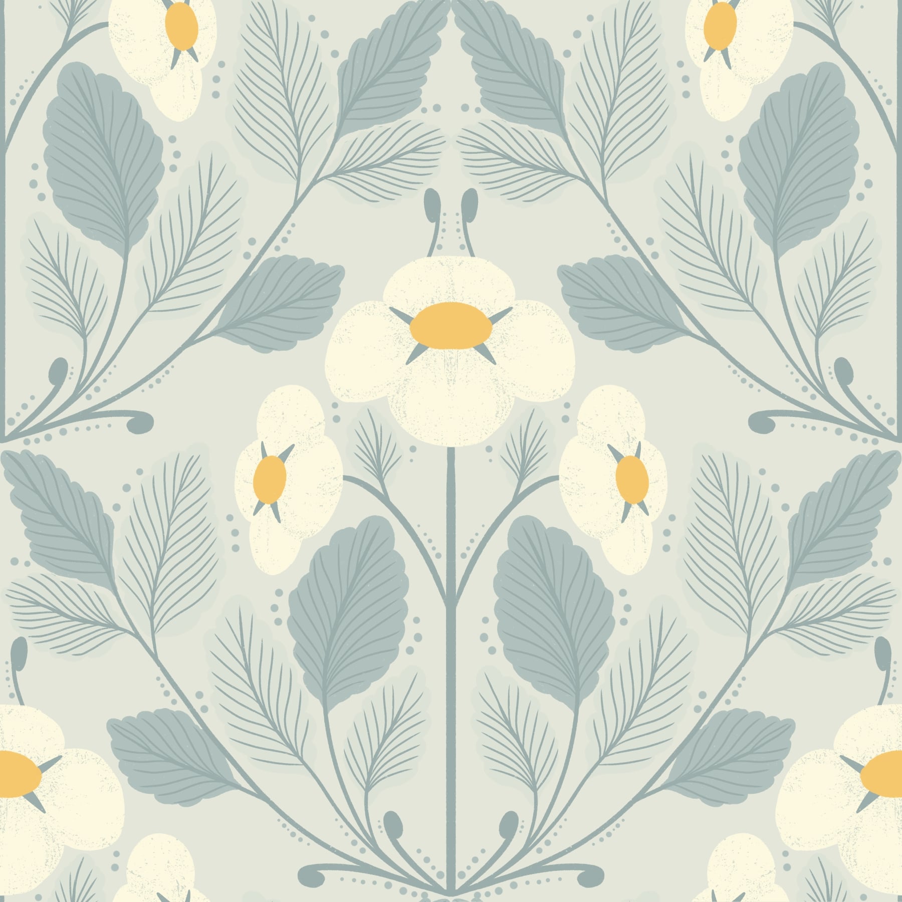 Bring a fresh, airy vibe to your interiors with Strawberry Folk – Mist Leaf wallpaper. This design blends creamy white florals, soft yellow centers, and pale green leaves on a light mist-toned background. The symmetrical folk-art pattern adds gentle rhythm, making it a great fit for kitchens, breakfast nooks, or craft rooms. Its soft tones and vintage-inspired layout offer a soothing yet playful feel that suits both modern and classic spaces. Ideal for anyone who enjoys botanical themes with a subtle folk touch, this wallpaper for walls adds charm without overwhelming the room’s natural light and texture.
