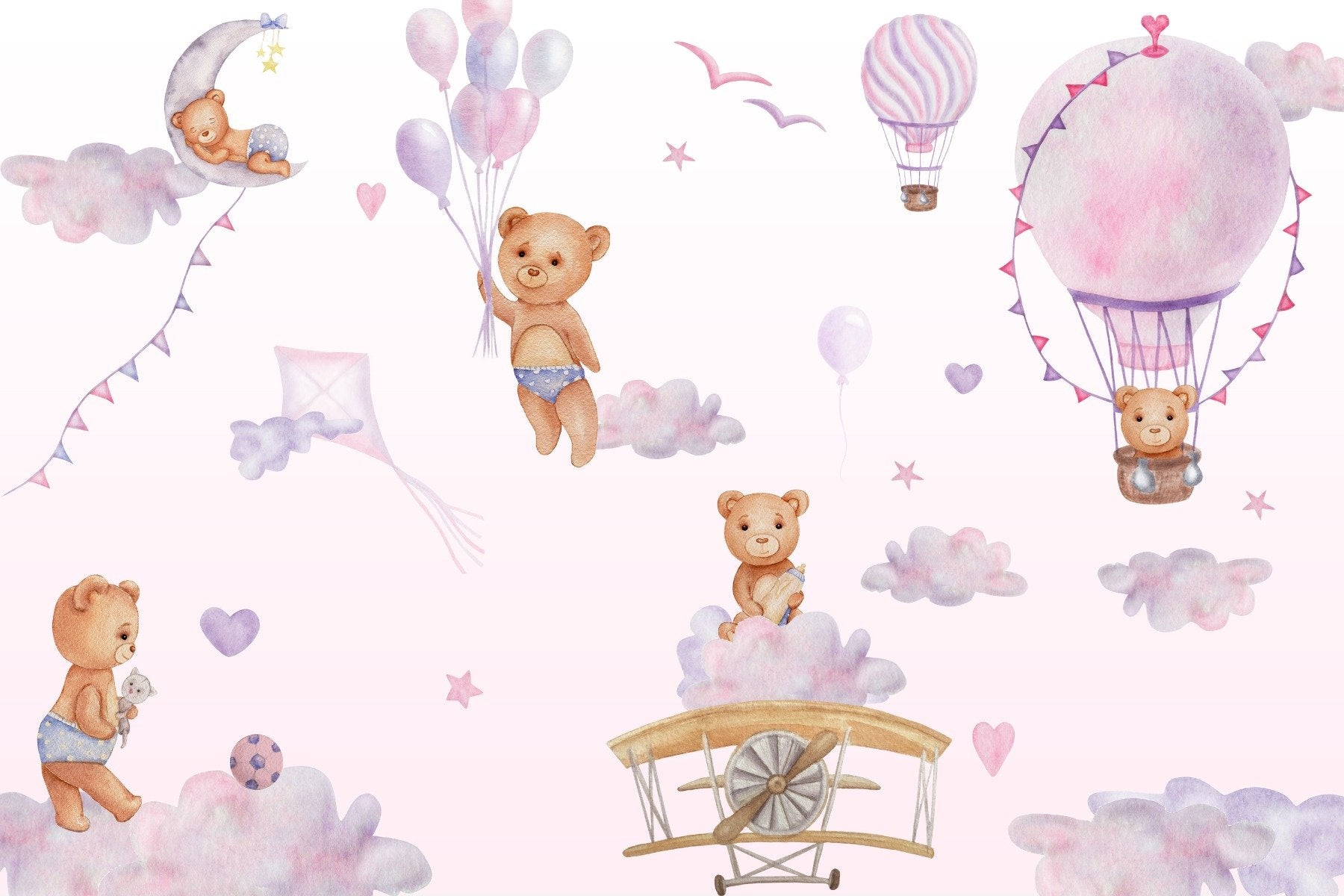 The bouncy bear sky journey mural is a delightful excursion into a realm where cuddly teddies float whimsically on clouds. This pink wallpaper is a heartwarming addition to any playroom, infusing it with a light-hearted, dreamy atmosphere that encourages playful exploration and gentle daydreaming. Each bear's joyful antics amongst the balloons and stars inspire stories of adventure and friendship, perfect for stimulating young imaginations. With its soft hues and charming illustrations, this sky wallpaper mural is designed to complement a space where laughter and play are the essence of the day. It's a visual lullaby that wraps a room in warmth and sweetness, inviting little ones into a sky-high journey with their plush companions. This playroom wallpaper is more than just a decor it's a narrative of fun and flights of fancy.