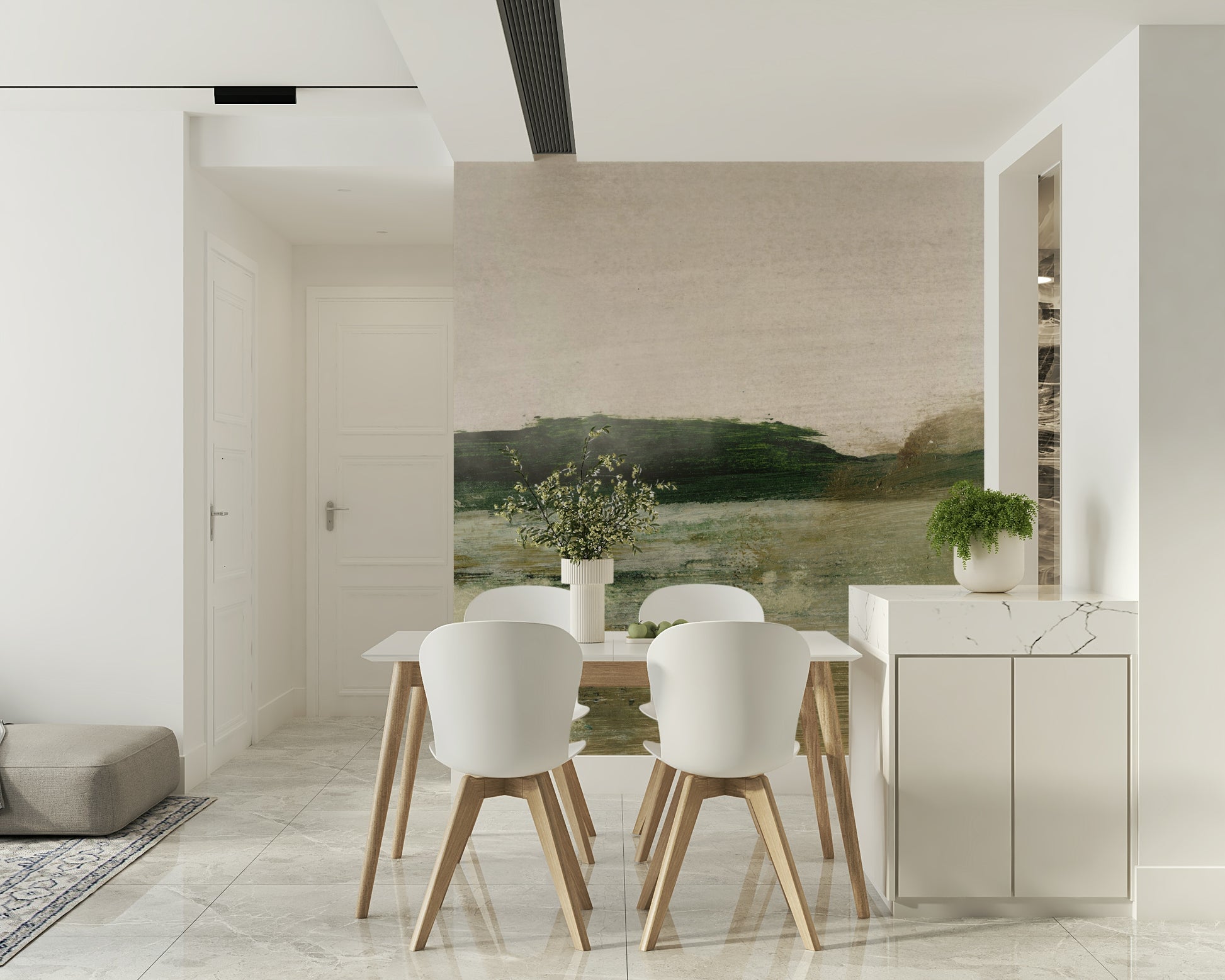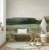 Bring a sense of calm to your space with this gentle landscape. This design features horizontal brushstrokes in muted greens, beige and white, creating an abstract horizon. The colors and texture give it a handcrafted feel. Install this wallpaper for walls in a bedroom or hallway to create a soothing mood. Its subtle beauty will enhance a modern or minimalist interior.