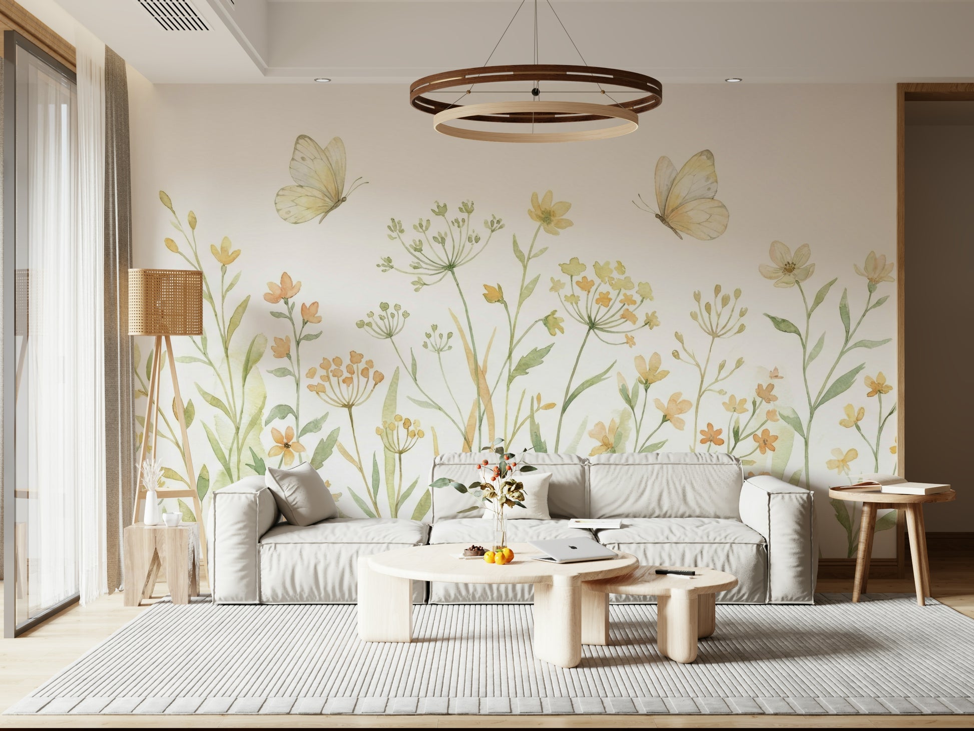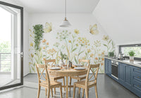 Transform your living space with this delicate watercolor-style wallpaper for walls. The soft floral pattern, featuring dainty butterflies and wildflowers, brings a touch of nature's tranquility indoors. A harmonious blend of pastel yellow, beige, and green creates a soothing atmosphere. This wallpaper works beautifully in bedrooms, nurseries, or living rooms, lending a serene and charming touch. Install it in a hallway for an inviting flow, or bring serenity to a home office. The detailed design and gentle color palette effortlessly enhance the interior spaces, creating a calming and welcoming ambiance.