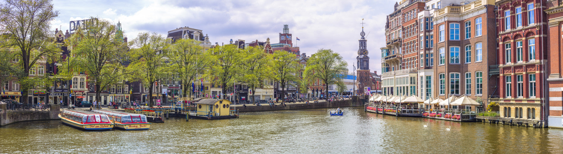 Boats in Amsterdam canal. Experience Amsterdam's beauty with this scenic canalside view. This wallpaper for walls offers a glimpse of historic buildings along a tree-lined canal. The design incorporates the colors of the aged brick and the soft greens of spring. It suits a dining room or entryway, bringing a touch of European elegance to your interior. The wallpaper's detail and realistic imagery enhance any decor.