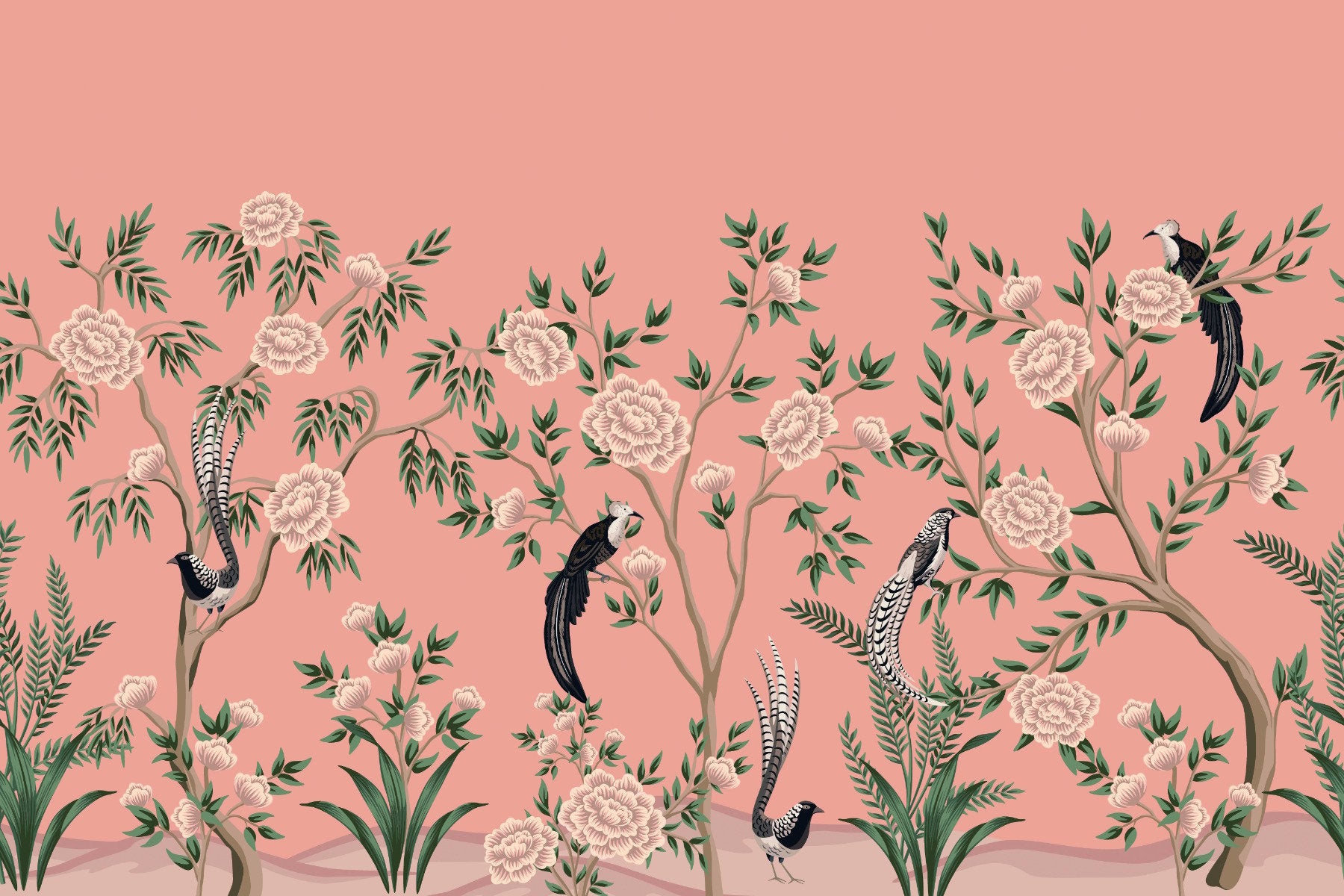 Asian-inspired chinoiserie wallpaper with flowers and birds.