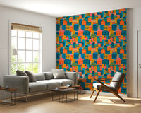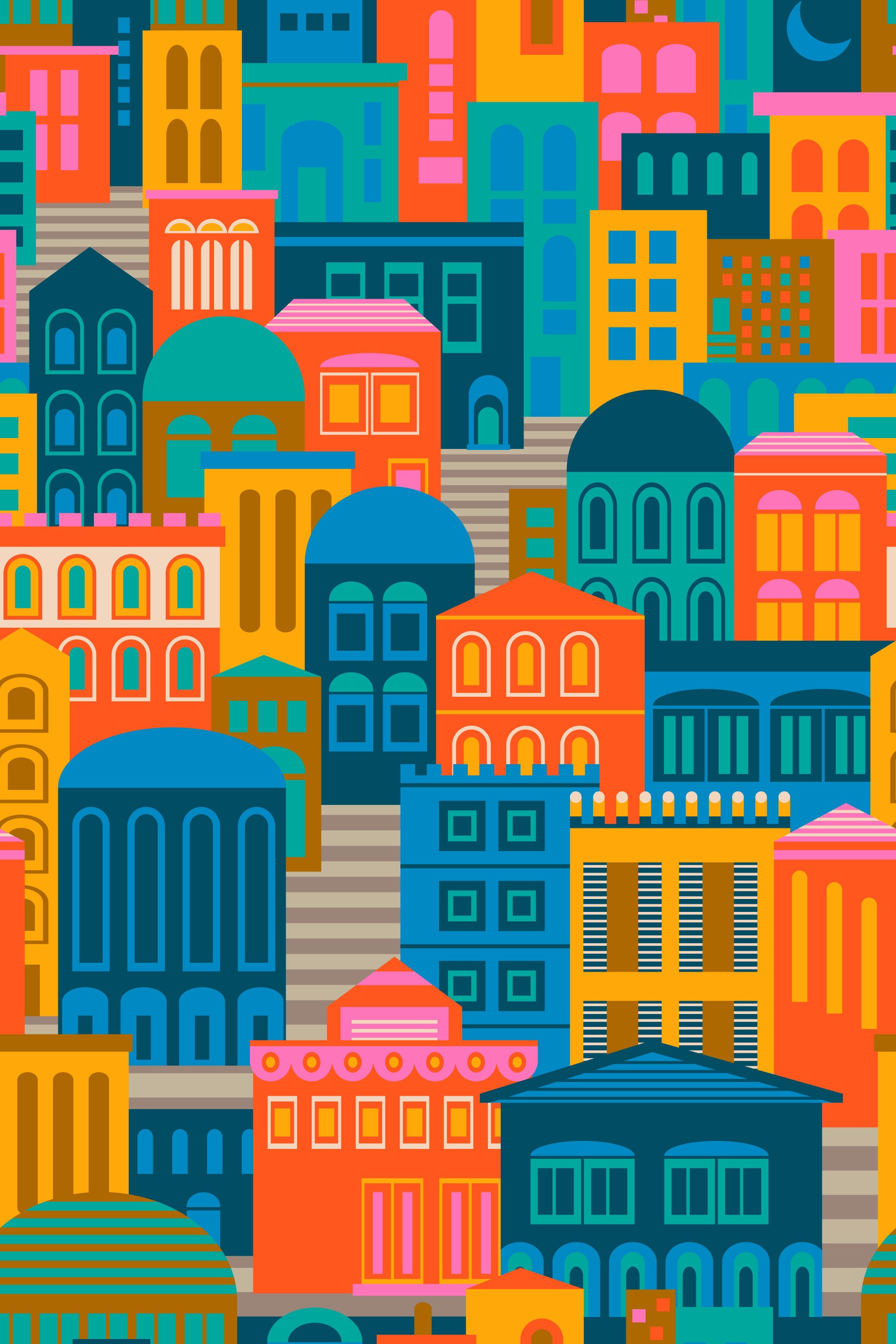 Geometric, colorful architecture buildings, high-rises and houses with a night moon in fun retro Rainbow Brights: Dark Blue, Royal Blue, Coral Orange, Yellow, Pink, Turquoise, Brown and Cream with striped backdrop! Bright, pop and fun cityscape inspired by vintage travel posters! This Repeat Pattern Design is also available in a Wall Mural version too! Also see my co-ordinating "City Lights By Day" pattern design and wall mural. Original Wall Mural design by Jackie Tahara of UnBlink Studio.