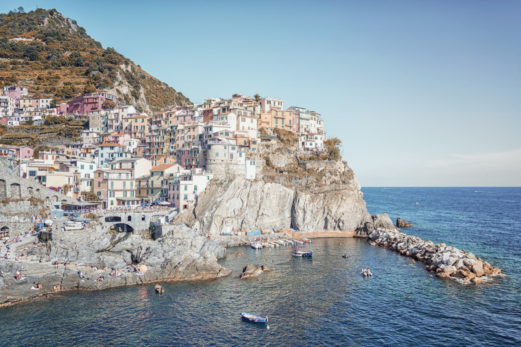 Transform any room with this scenic wallpaper for walls, capturing a breathtaking view of a coastal village clinging to a cliff. The soft color palette of pastels and earth tones lends a peaceful ambiance, making it perfect for bedrooms or bathrooms. The layered composition, with its houses, cliff, and sea, creates depth and visual interest. Bring a sophisticated, travel-inspired aesthetic to your home. Consider it for a feature wall to craft a calm oasis.