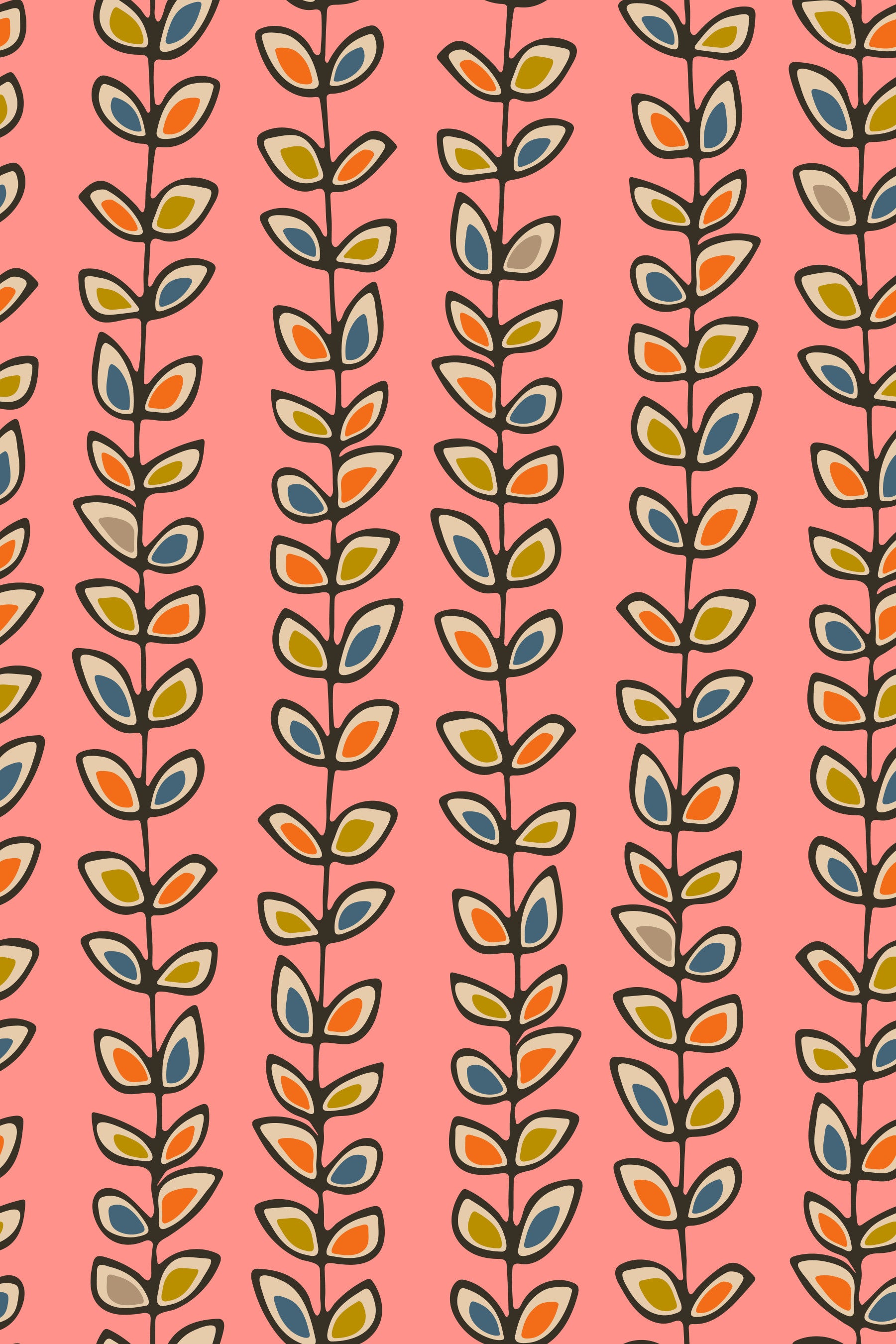 A charming vintage-style wallpaper with colorful leaves arranged along slim vertical vines on pink.