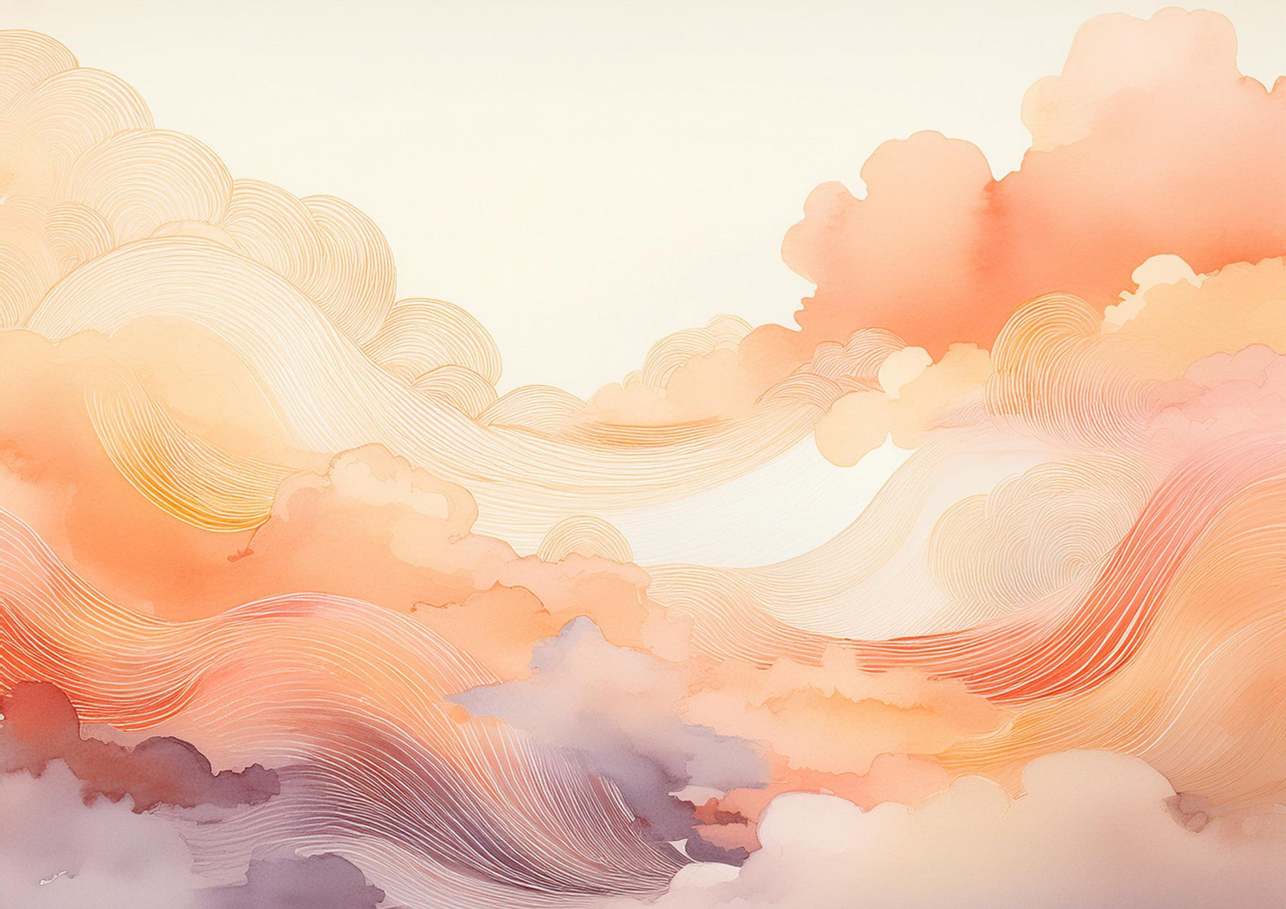 This wallpaper design captures the ethereal beauty of a celestial landscape. Soft watercolor washes in warm peach, apricot, and muted mauve create a dreamy atmosphere. Intricate line work depicting swirling clouds adds a touch of elegance and sophistication. The overall effect is one of calm and peaceful contemplation, inviting viewers to lose themselves in the gentle ebb and flow of the celestial scene. The interplay of delicate lines and soft colors creates a sense of serenity and balance. Ideal for bedrooms, meditation spaces, or any room seeking a peaceful and stylish backdrop.