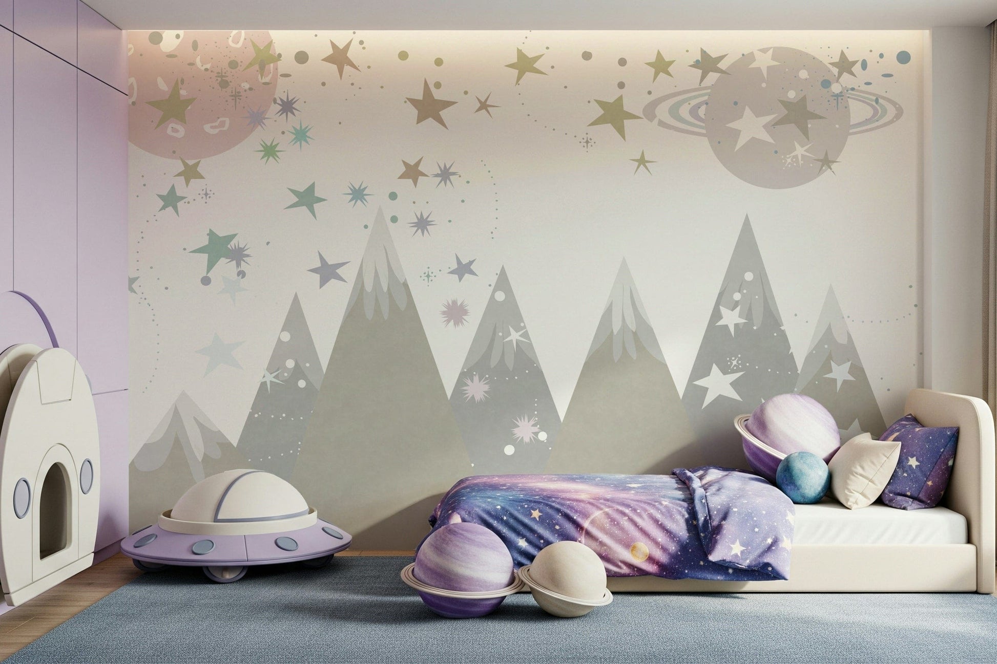 Invite wonder with this celestial-themed wallpaper for walls. Soft pastel planets and twinkling stars float above a serene mountain range. Neutral grays and blush tones create a peaceful mood, perfect for a nursery or bedroom. The playful design encourages imagination and adds a touch of magic to any child's space. It also works well in a playroom, fostering a calm and creative environment.