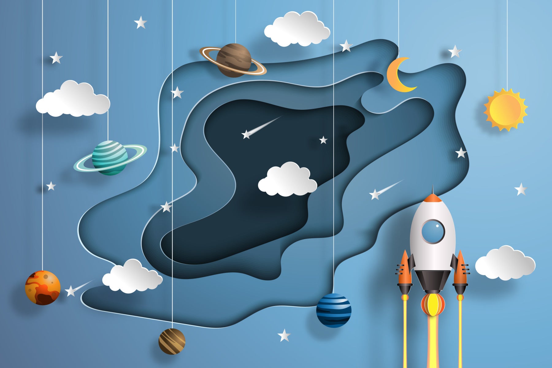 Launch into dreamland with this whimsical outer space design! The layered paper effect adds depth, while planets, stars, and a soaring rocket create a playful scene. Soft blues, oranges, and yellows bring a comforting mood. This wallpaper for walls fits perfectly in a nursery, kids' room, or playroom. It sparks imagination and complements modern, Scandinavian, or minimalist interiors. Let this design transform a simple space into an astronomical adventure!