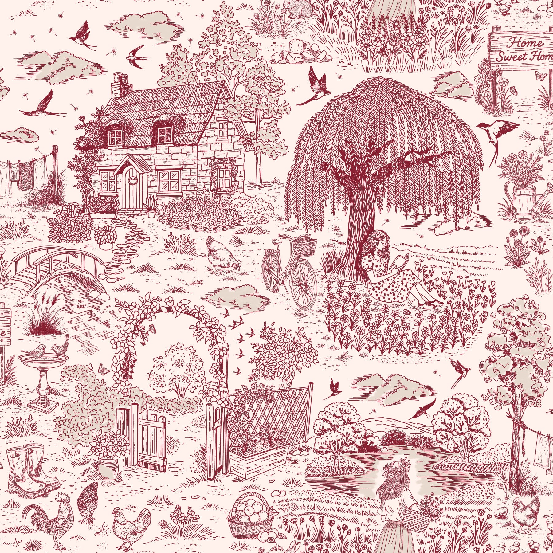 Homely Toile wallpaper, sweet Country Charm illustration.