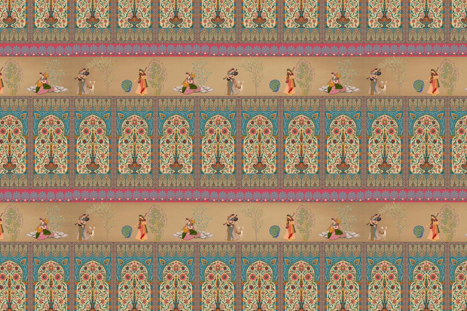 Infuse your home with the charm of a royal garden using this ornate wallpaper for walls. The design features musical figures set against a backdrop of stylized trees, flowers, and architectural motifs. The color scheme blends soft beiges with vibrant teals, corals, and greens. This mural brings a timeless elegance to living spaces, enhancing the ambiance of dining rooms and bedrooms. Its intricate patterns and soothing palettes make it suitable for creating a refined entryway or a tranquil reading nook. The elaborate detail introduces an element of classic sophistication to your décor, infusing the space with artistic allure.