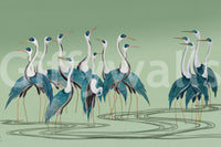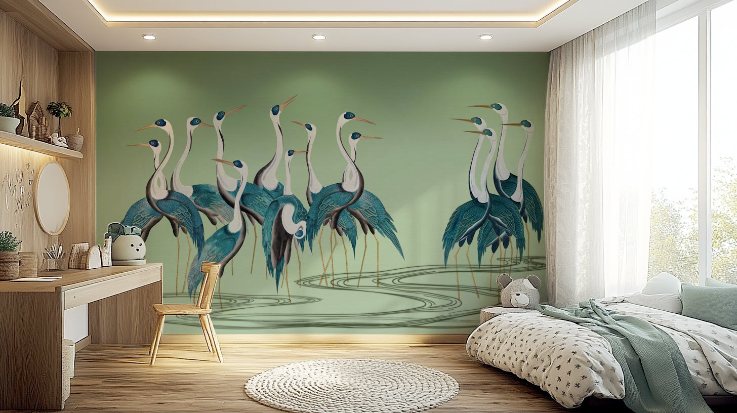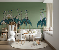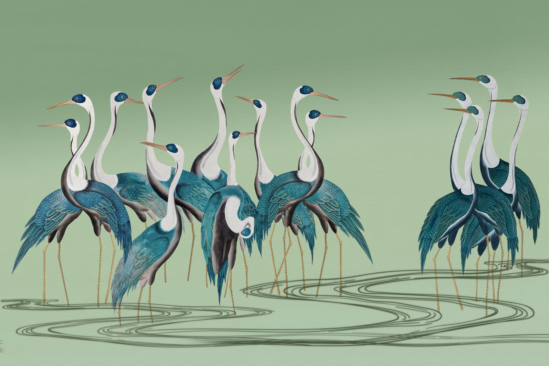 Invite a serene elegance into your home with this captivating crane design. The birds gather in a calming scene, their blue plumage adding a touch of sophistication to any room. This wallpaper for walls features delicate lines and a soft, muted palette, creating a tranquil backdrop. Imagine this mural transforming your living room into a peaceful sanctuary or lending a touch of zen to your bedroom. The intricate detailing and graceful composition work beautifully in hallways or dining rooms, adding a touch of artistic flair and understated luxury. This design complements both modern and classic interiors.