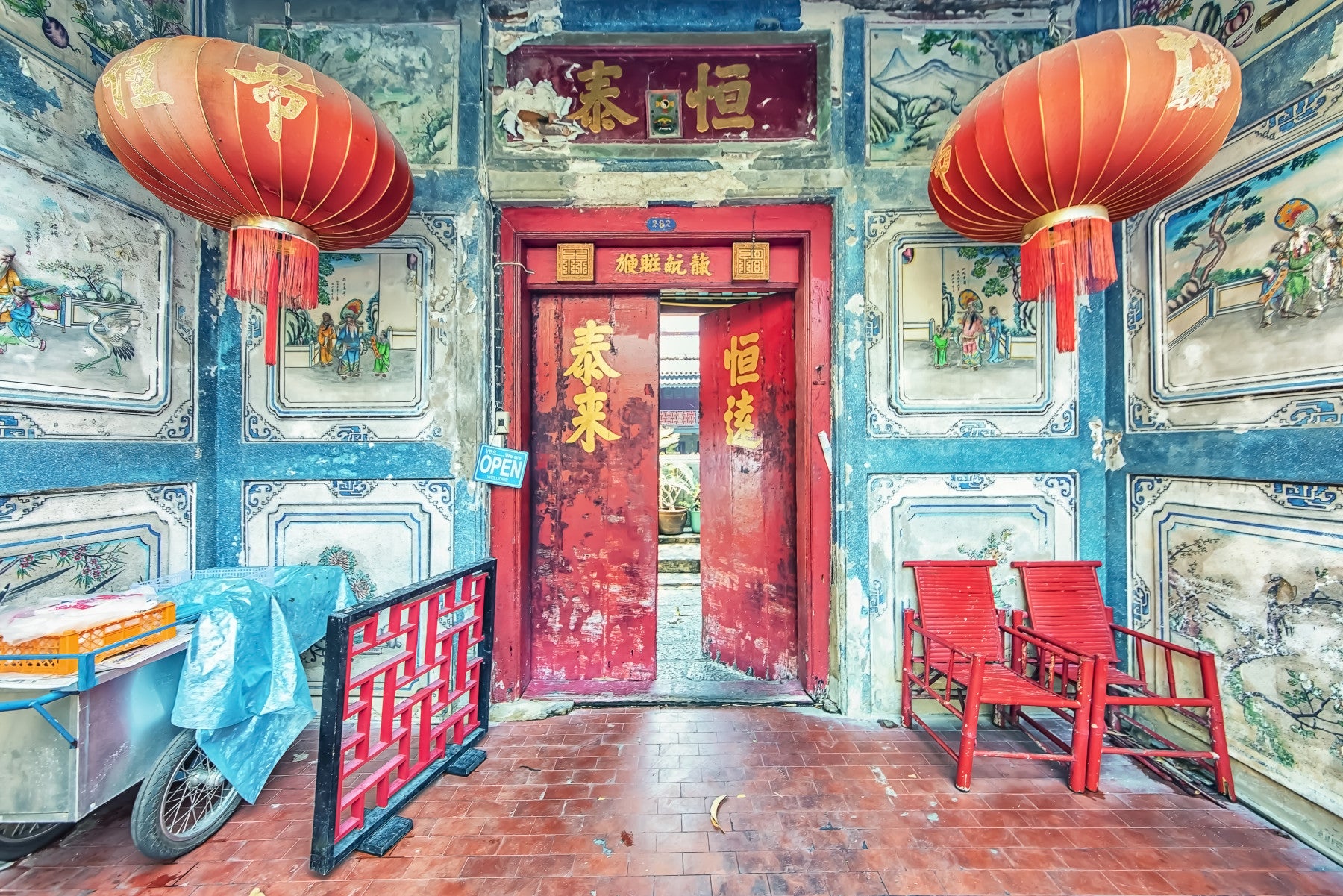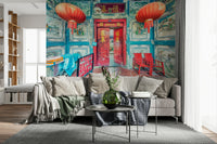 Immerse yourself in Asian artistry with this wallpaper design showcasing crimson lanterns casting a warm glow over aged walls adorned with paintings. This vivid composition, balances the striking red tones with weathered blues. Transform living spaces with a piece evoking both tranquility and artistic flair. Consider this wallpaper for walls in a bedroom to add a unique touch. Its balanced color palette and artistic composition make it suitable for various design choices, creating a stunning backdrop.