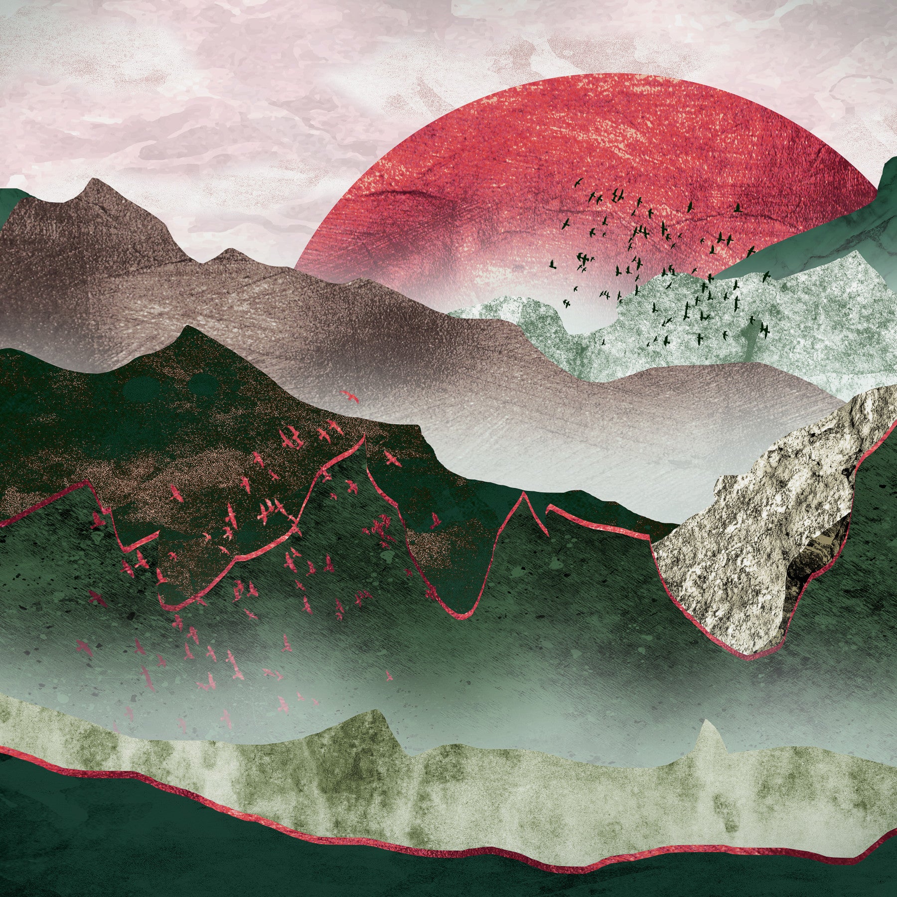 This abstract landscape wallpaper captures a breathtaking sunset over a range of misty mountains. The crimson sun dominates the sky, casting a warm glow on the layered peaks rendered in deep greens, muted browns, and textured greys. Flocks of birds fly across the scene, adding a sense of movement and tranquility. The overall effect is one of serene beauty and quiet contemplation, perfect for creating a calming and sophisticated atmosphere in any room.