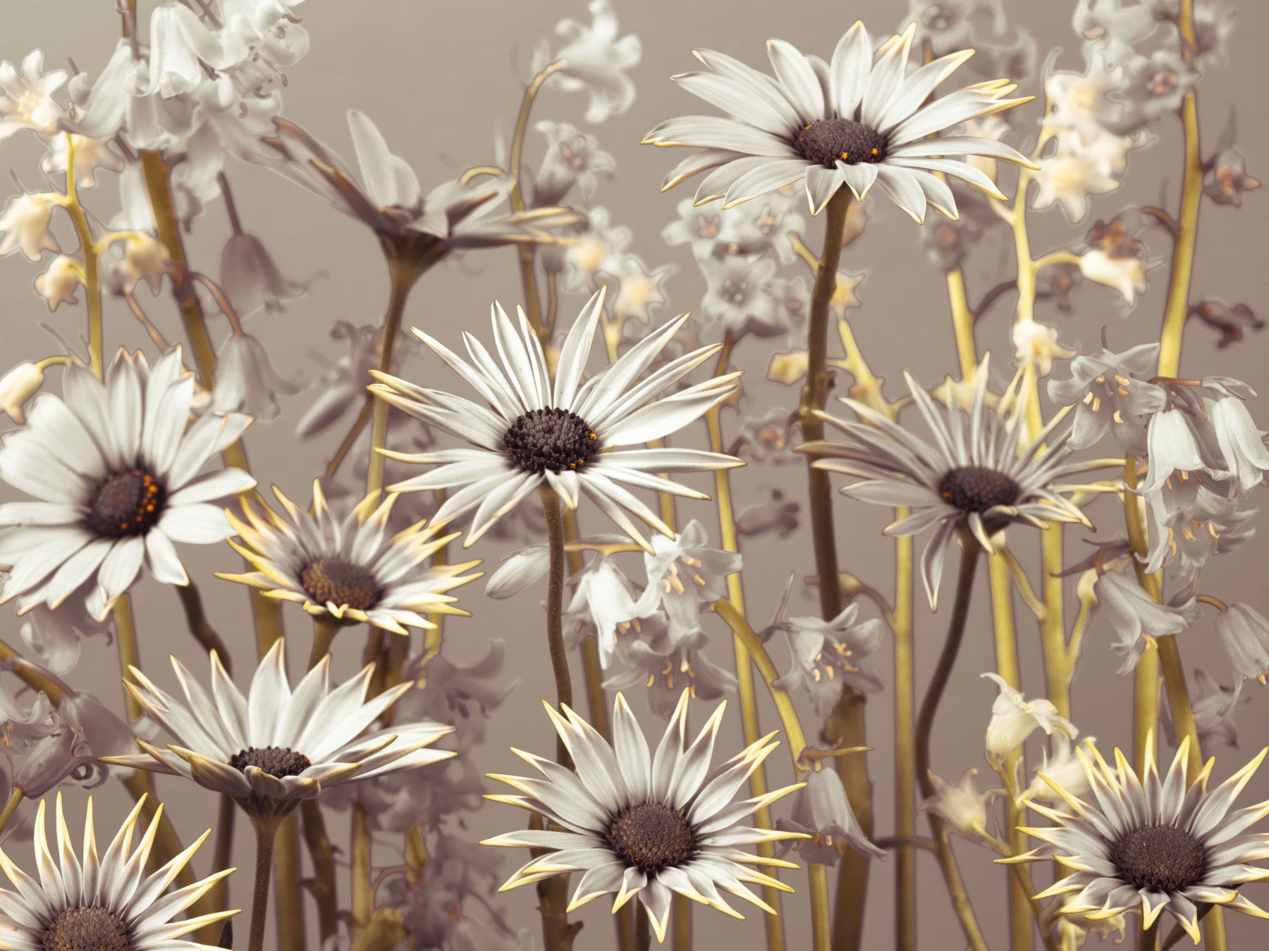 Botanical wallpaper with large daisy blooms and soft-focus blossoms creating a serene atmosphere.