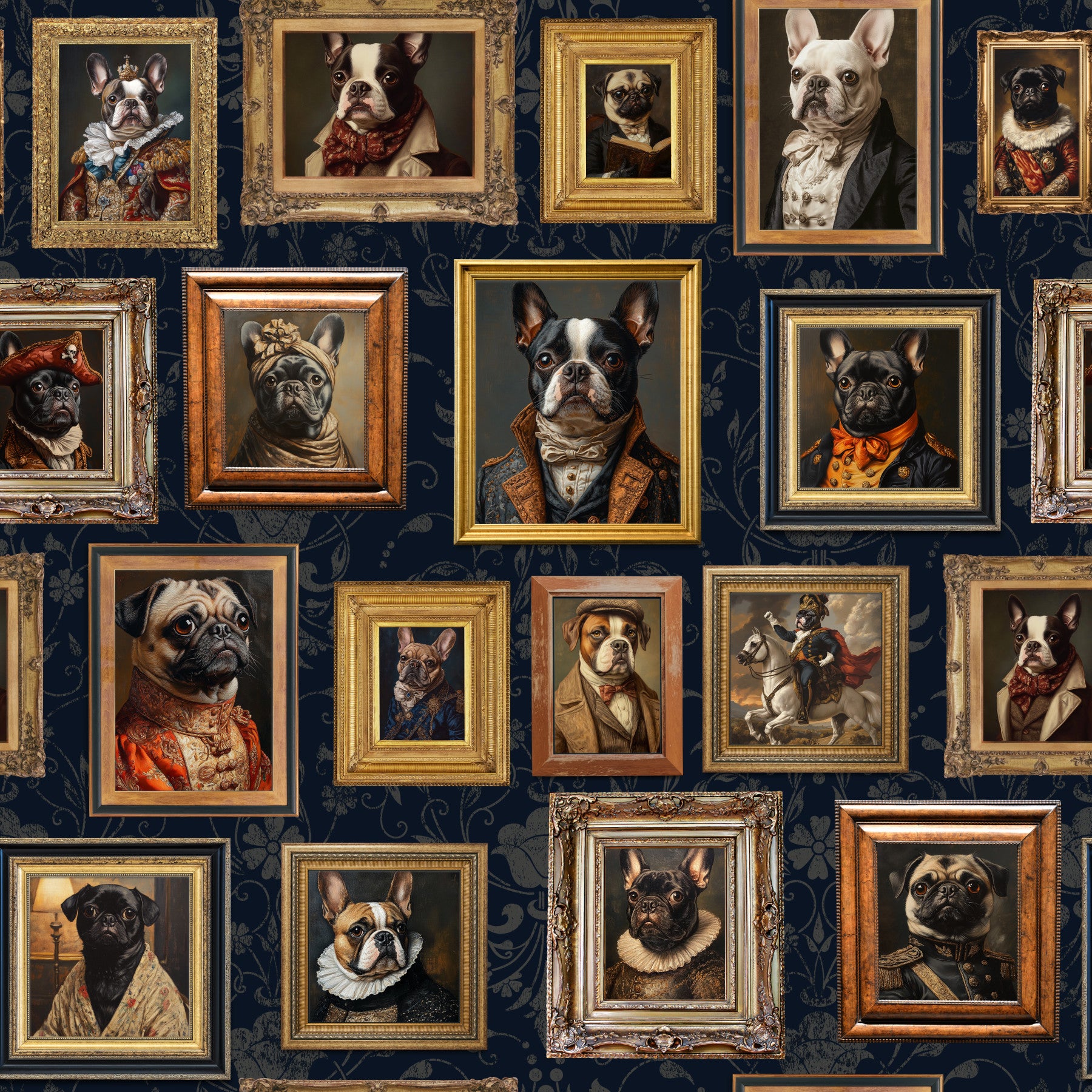 Elevate your home with this gallery of dapper dogs. This sophisticated wallpaper design features portrait paintings of different dog breeds in elegant, aristocratic attire. Each pup is encased in ornate golden frames set against a classic navy floral background. This wallpaper for walls transforms any space into an artful display of canine charm. Enhance a living room, study, or entryway with this unique and eye-catching design, which brings a touch of sophistication and playfulness to interior spaces.