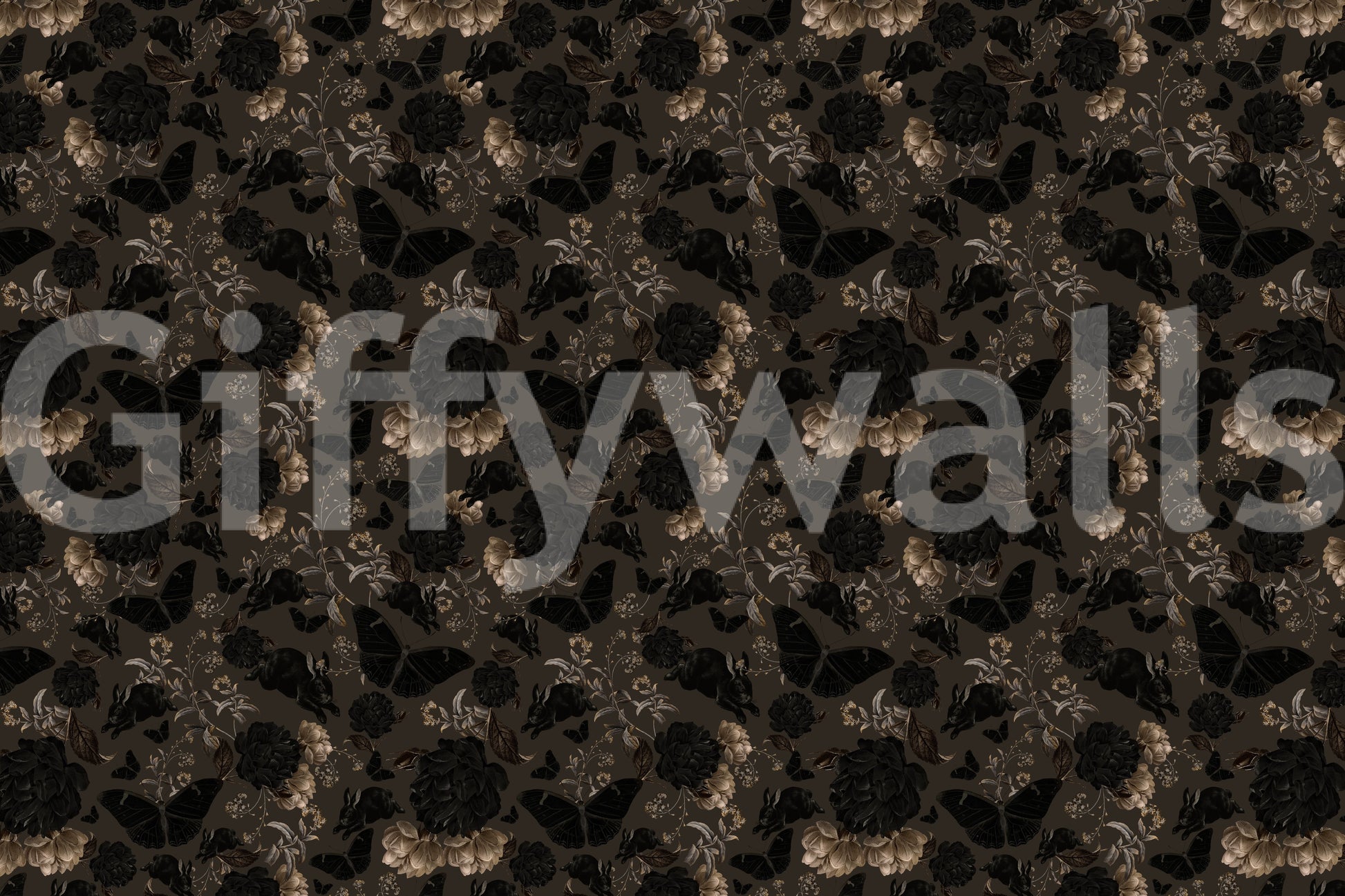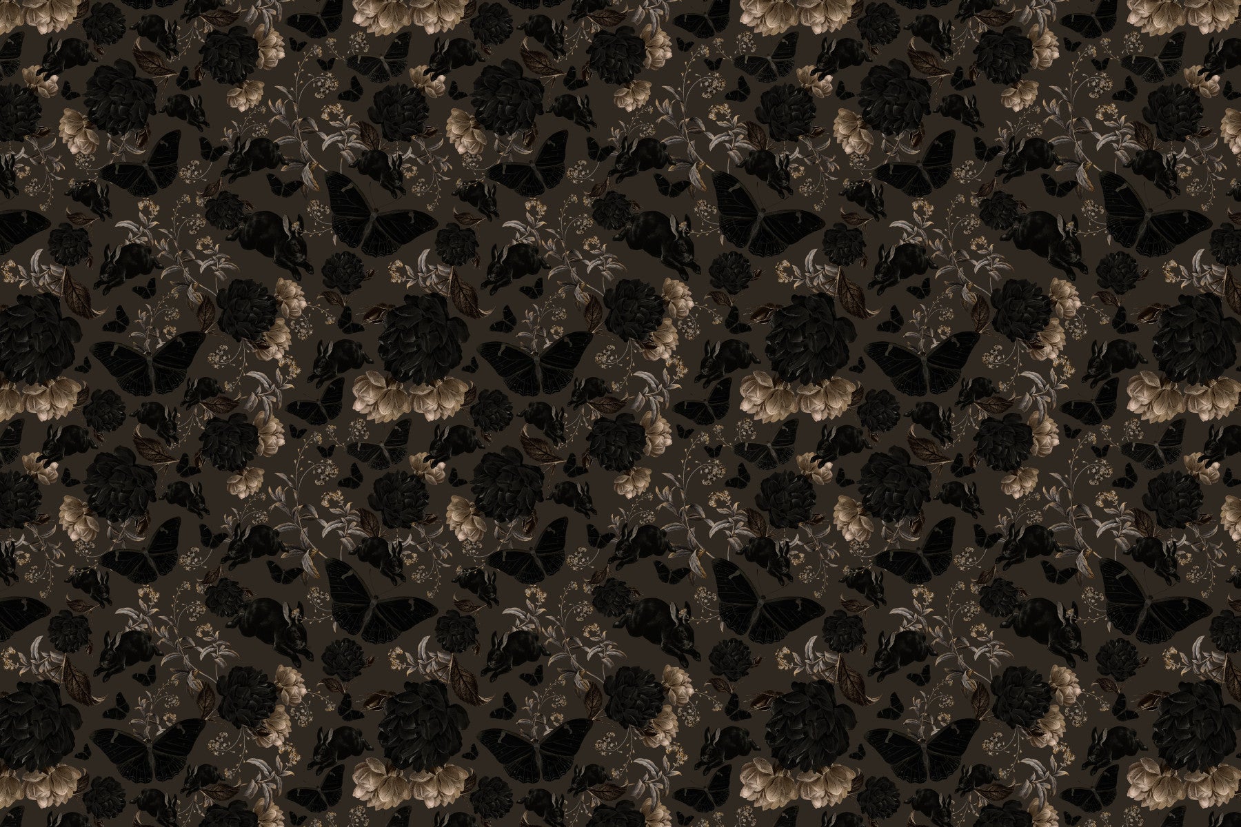 Bring a touch of mystery indoors with this moody floral and fauna pattern by Uta Naumannn. It features a dark backdrop enhanced with elegant black flowers, rabbits, and butterflies. This wallpaper for walls is perfect for creating a dramatic accent in a bedroom or adding sophistication to a living room. The design's rich color palette also suits a hallway or dining room, offering a luxurious ambiance.