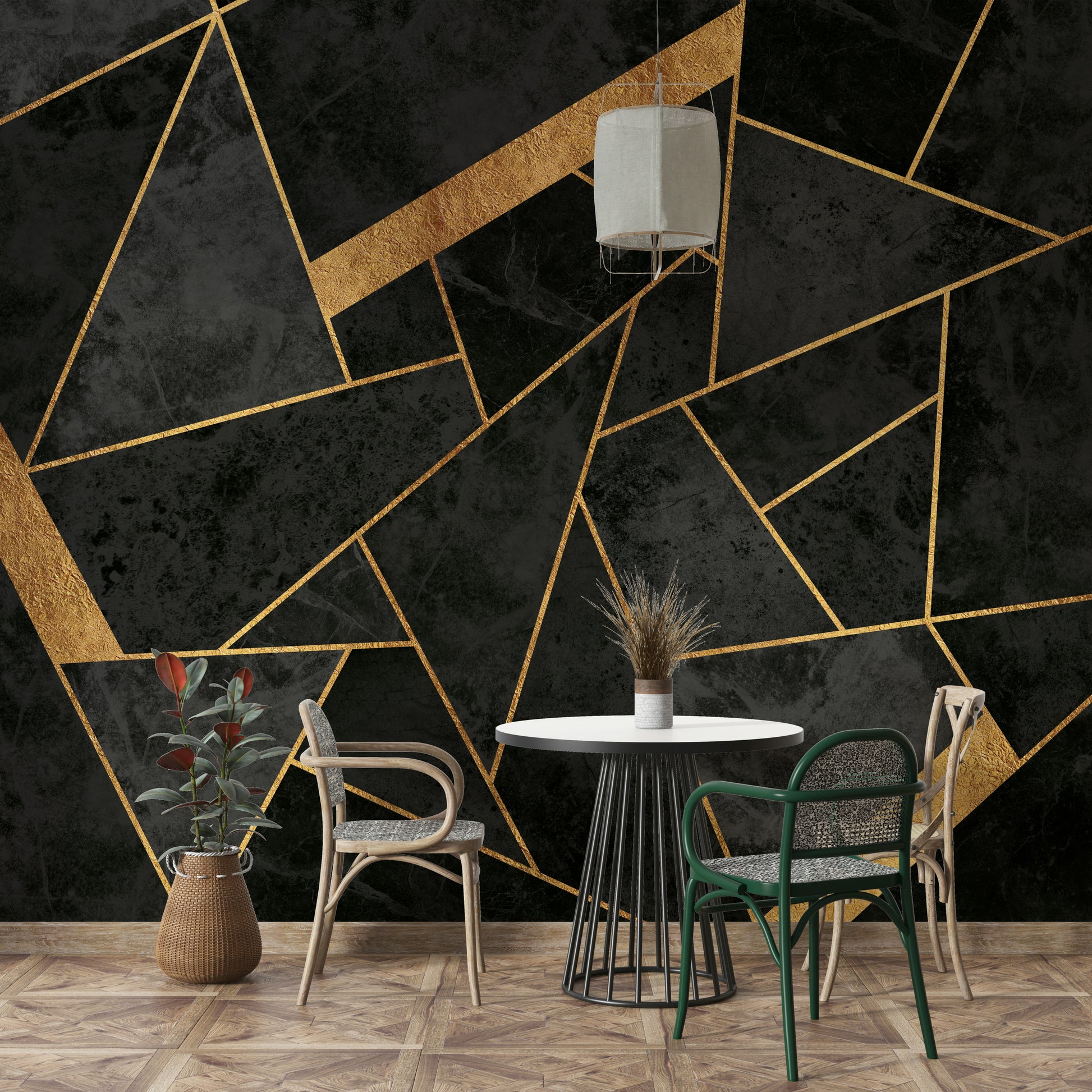 Transform your room with the sophisticated flair of Dark Charcoal and Soft Gold Mosaic wallpaper. This design features a striking combination of deep, rich tones and shimmering metallic accents, arranged in a contemporary geometric pattern. Perfect for adding a touch of elegance to any room, the wallpaper creates a luxurious atmosphere. Ideal for living rooms, bedrooms, or any space in need of an artistic upgrade without overwhelming the senses. Infuse your home with this modern yet timeless aesthetic.