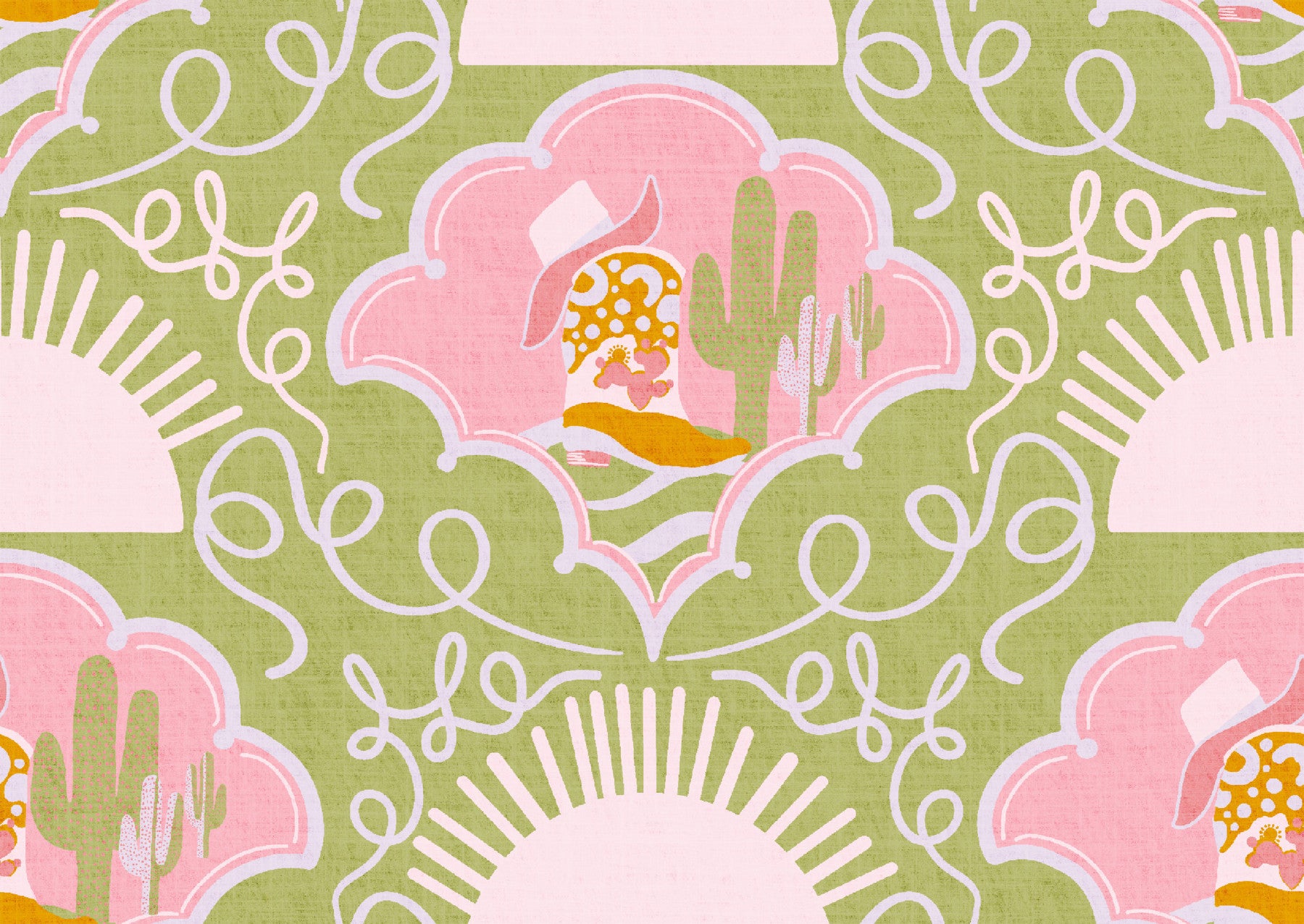 Bring a touch of playful western charm to your space with this delightful wallpaper for walls. The design features cacti, cowboy boots and sun rays framed with ornate curves in a soft color palette of pinks, greens, and yellows. These colors evoke a retro-inspired feel, creating a cozy atmosphere that can brighten up any room. Consider using it in a kids' room, a hallway, or even a bathroom to add a dose of whimsical personality. The simple shapes will also work well in a retro inspired kitchen.