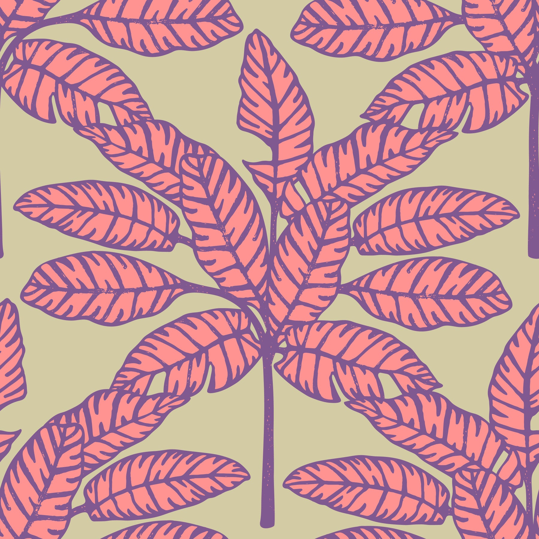 Bold tropical leaves in pink and purple on a warm cream-colored background.