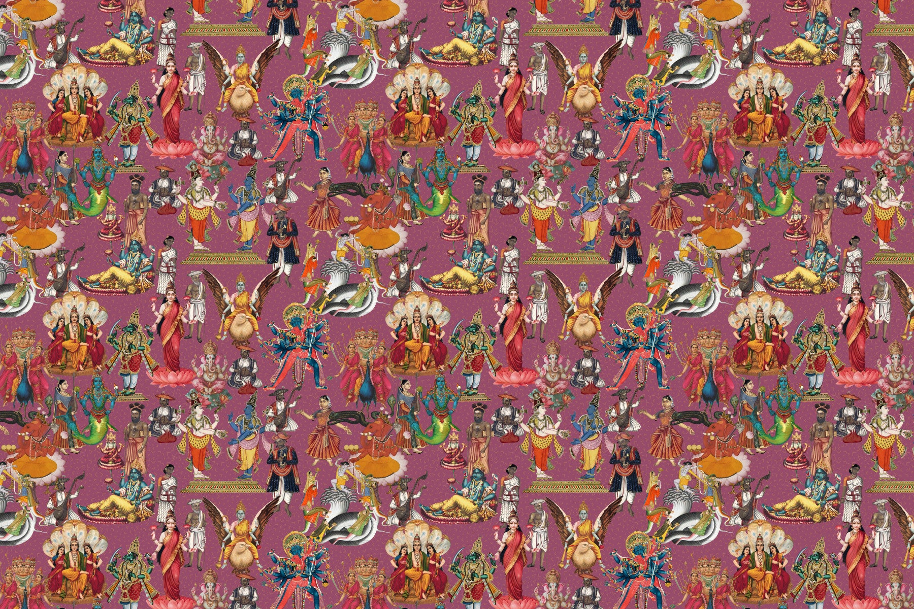 Transform your space with this exquisite wallpaper for walls, featuring a captivating, dense pattern of traditional Hindu deities and mythological figures. Richly detailed illustrations, reminiscent of classic Indian miniature paintings, adorn a deep plum background. The vibrant color palette showcases striking blues, emerald greens, radiant reds, golden yellows, and pristine whites, creating an opulent and culturally significant design. This wallpaper makes an extraordinary statement piece in living rooms, dining rooms, meditation areas, or entryways, infusing your interior spaces with spiritual depth and artistic grandeur. It complements eclectic, bohemian, or traditionally styled décors beautifully.