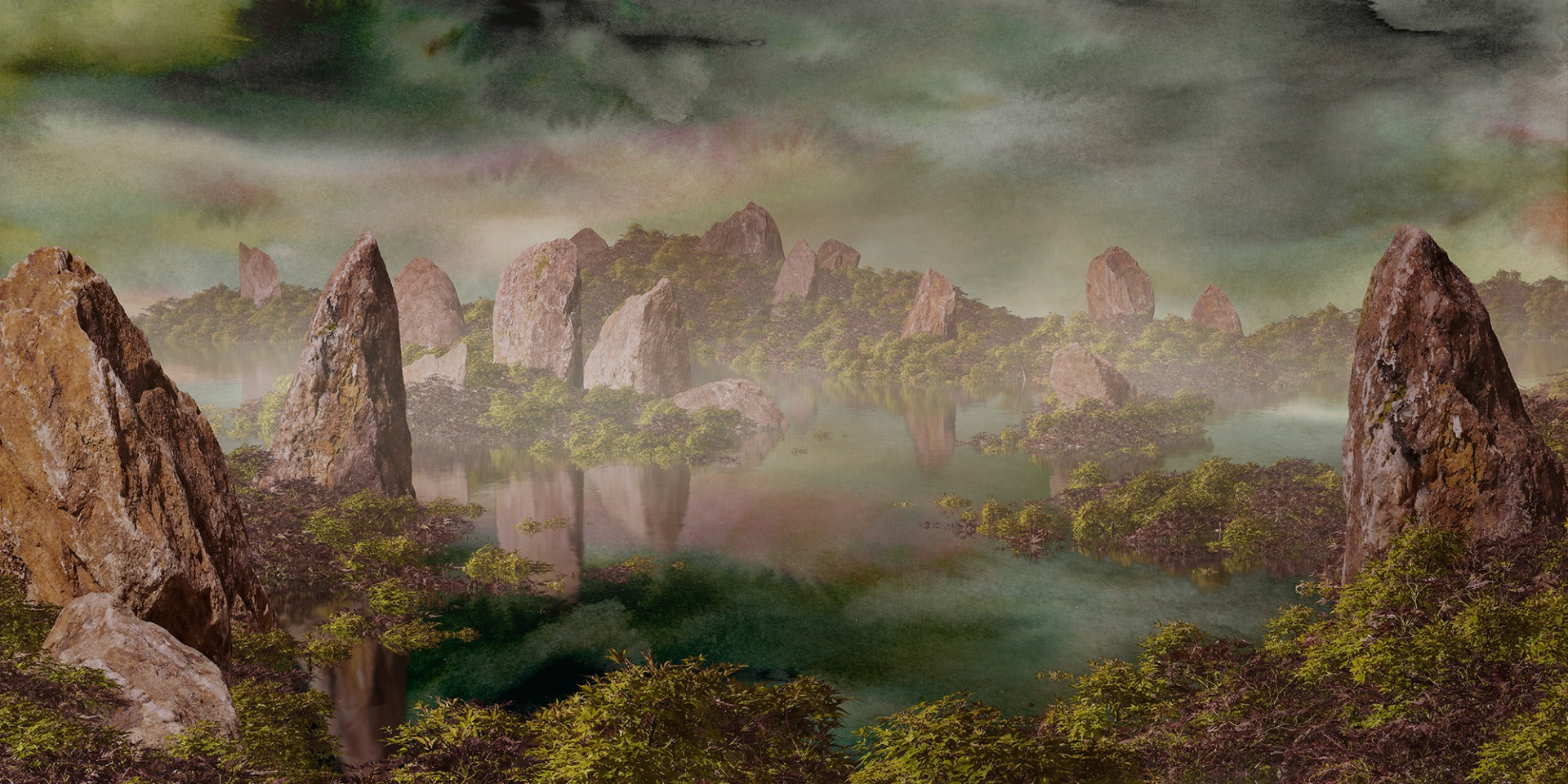 Stunning Chinese landscape wallpaper in dramatic green tones.