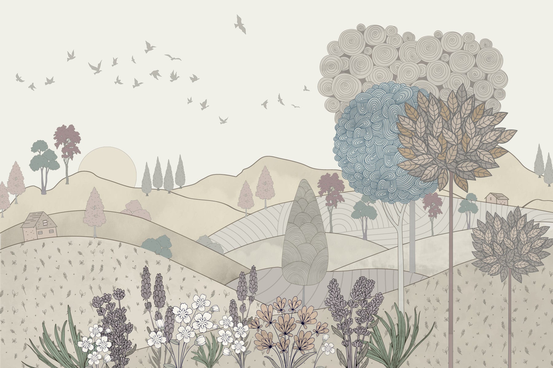 Bring a peaceful outdoor scene to your walls with this stylized wallpaper for walls. The delicate line work and pastel colors create a soothing atmosphere. Gentle hills, patterned trees and flying birds make up the peaceful composition. Ideal for a bedroom or home office, the design evokes a sense of calm. The wallpaper's neutral palette ensures it pairs effortlessly with a range of decor styles. It will be a great fit in boho, Scandinavian or minimalist styles.