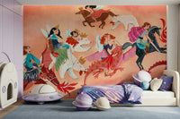 Enter a world of whimsical dreams with this delightful wallpaper for walls. Fairies and royals ride dragons, horses, and polar bears through the night sky. The hand-drawn style and soft, comforting colors of pink, beige, red, and blue make this wallpaper perfect for a child's bedroom or nursery. The fantasy theme brings a playful touch, blending seamlessly with both modern and classic interior styles. Let the story unfold on your walls.