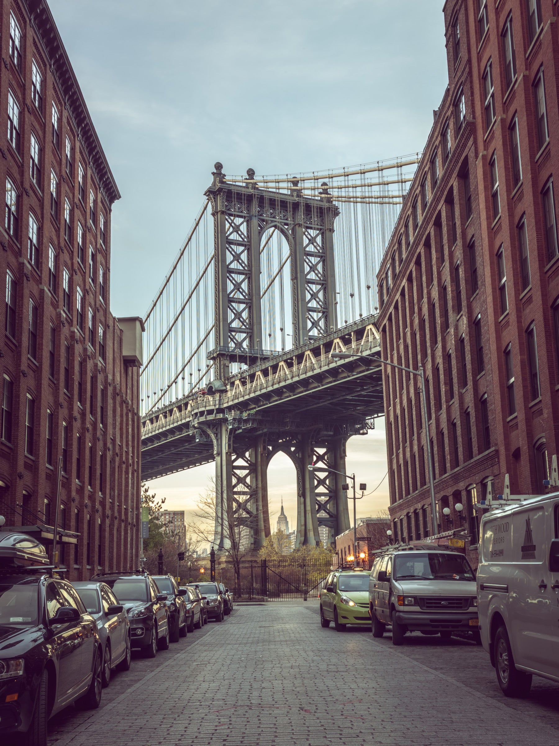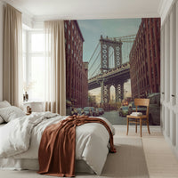 Manhattan Bridge seen from the Dumbo neighborhood in Brooklyn, New York. Capture the iconic charm of Brooklyn with this city wallpaper. Featuring the Manhattan Bridge framed by classic brick buildings and a tranquil sky, it adds an urban edge to any space. The sepia-toned palette brings warmth and works beautifully in a living room, office, or bedroom. Use this wallpaper for walls to create a stunning feature wall. The design creates depth and character, lending a metropolitan vibe to interiors. It complements both modern and industrial decors and helps create an exciting focal point.