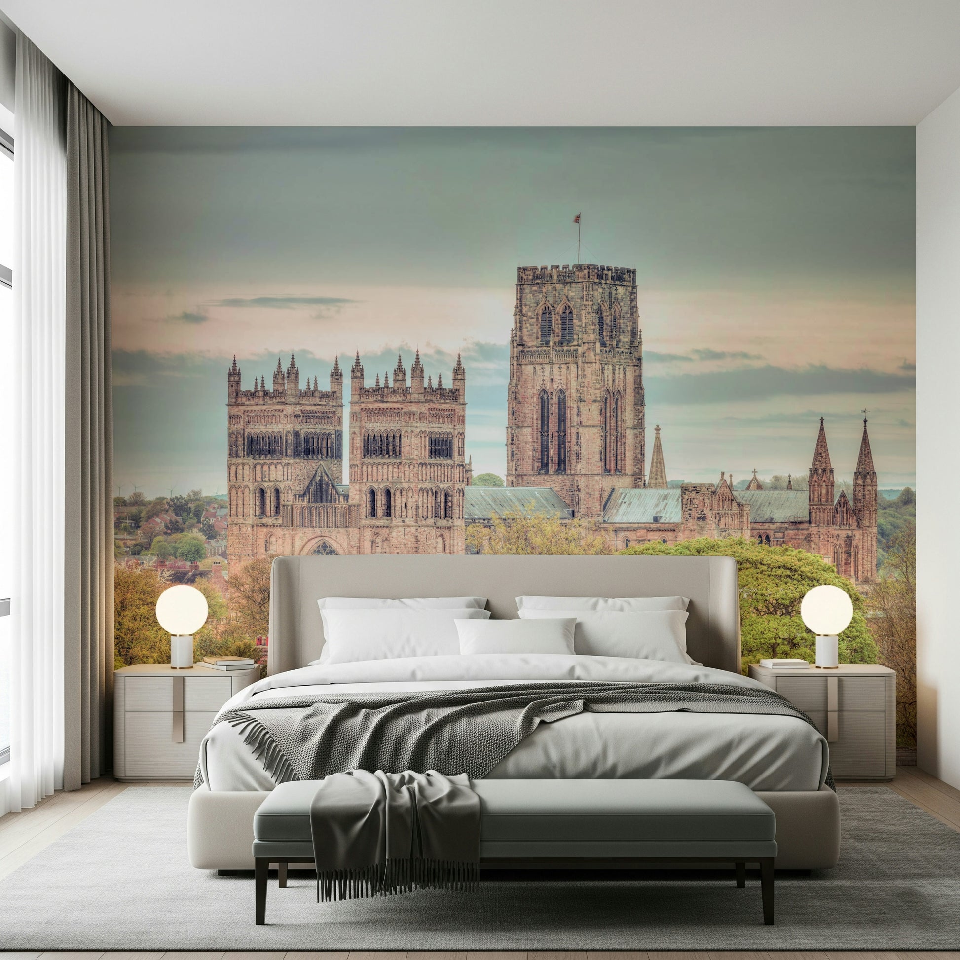 Capture the timeless grandeur of Durham Cathedral with this breathtaking wallpaper. The image showcases the cathedral's imposing towers and intricate stonework under a soft, ethereal sky, blending the majestic architecture with the serenity of nature. Lush greenery at the base provides a vibrant contrast to the aged stone, symbolizing the enduring spirit of this historic landmark. The composition draws the eye upwards, emphasizing the cathedral's soaring height and intricate details. This wallpaper brings a touch of historical elegance and tranquil beauty to your digital space, perfect for history enthusiasts, architecture lovers, or anyone seeking a visually stunning and calming backdrop. Elevate your screen with this iconic view, a reminder of the lasting legacy of Durham Cathedral.