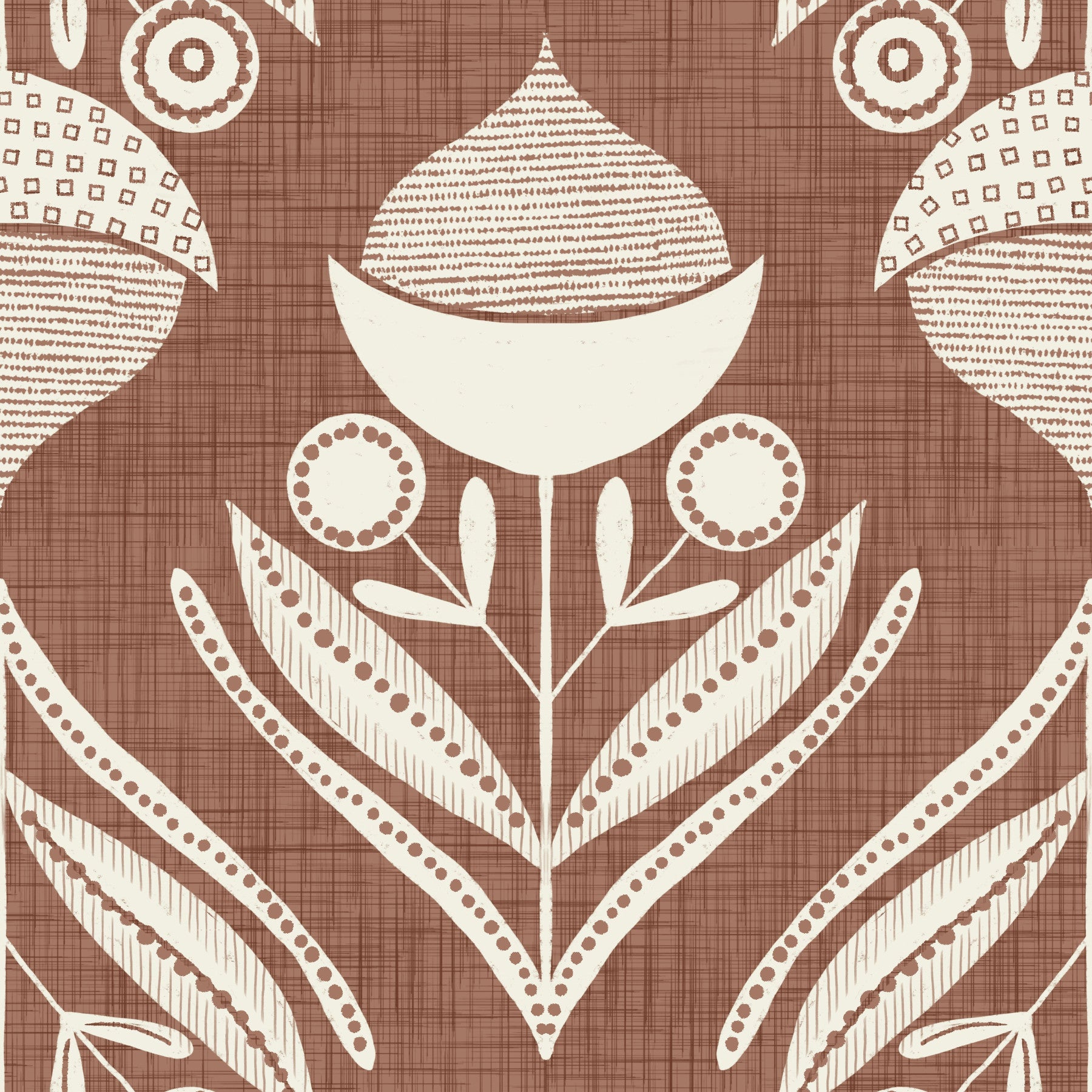 Terracotta floral wallpaper with symmetrical folk-style botanical illustrations in cream