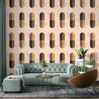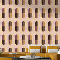 A modern and minimalist wallpaper featuring a geometric pattern in warm, earthy tones. The design utilizes a repeating motif of rounded rectangles in shades of beige, brown, mauve, and a delicate pink, creating a balanced and visually appealing composition. The subtle textural variation within each color adds depth, while the overall palette evokes a feeling of calm and natural serenity. This design is perfect for those seeking a sophisticated yet understated look in any room of their home.