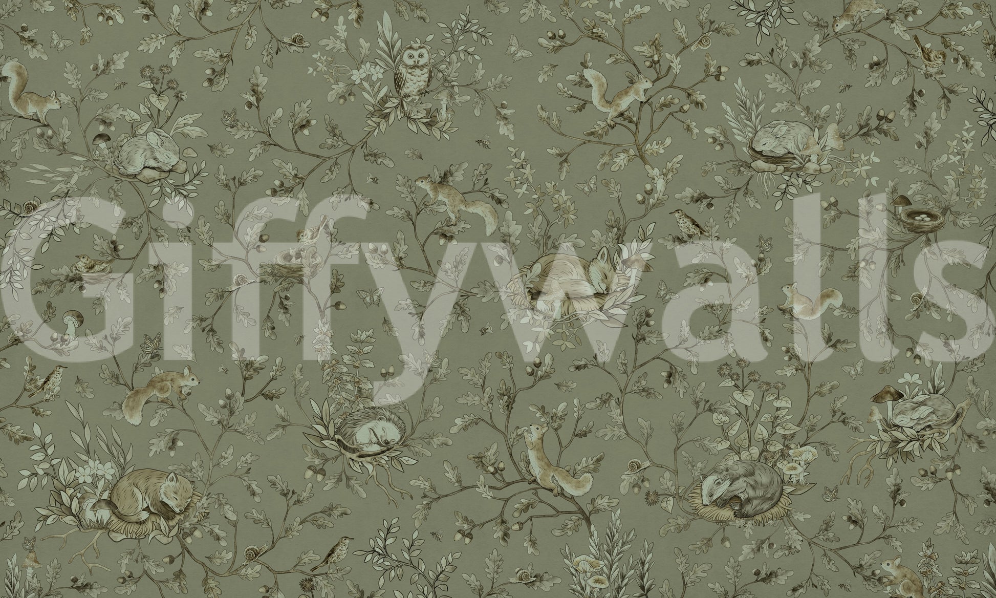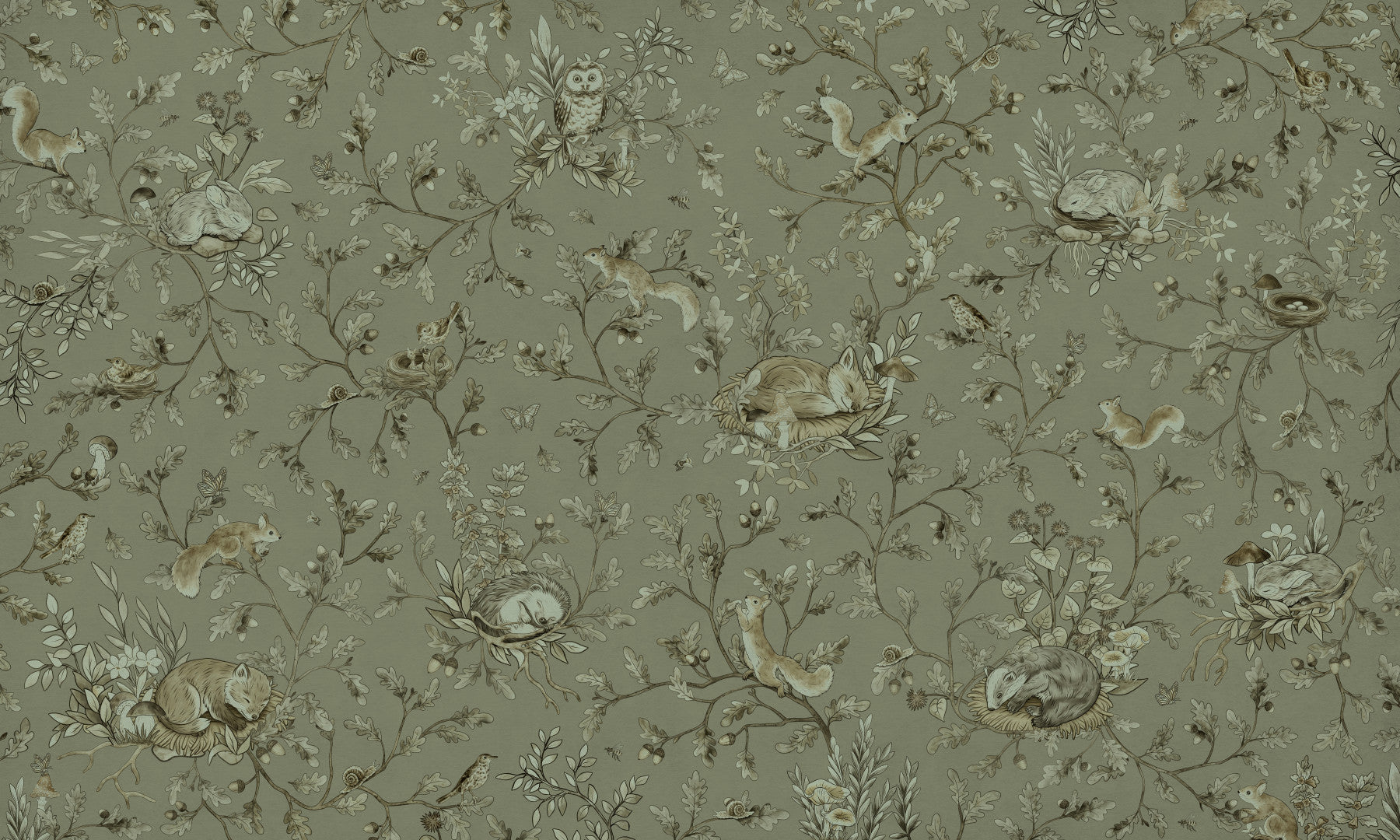 Transform your space with this earthy, forest-themed wallpaper. The design features squirrels, foxes, owls, butterflies and snails amidst detailed oak leaves and branches, all rendered in a soft, monochromatic palette. This design brings nature indoors to create a restful atmosphere in any room. Enhance any space with this luxurious wallpaper for walls; it's ideal for bedrooms, living rooms, or children's rooms. Its understated elegance creates a tranquil yet stylish interior.