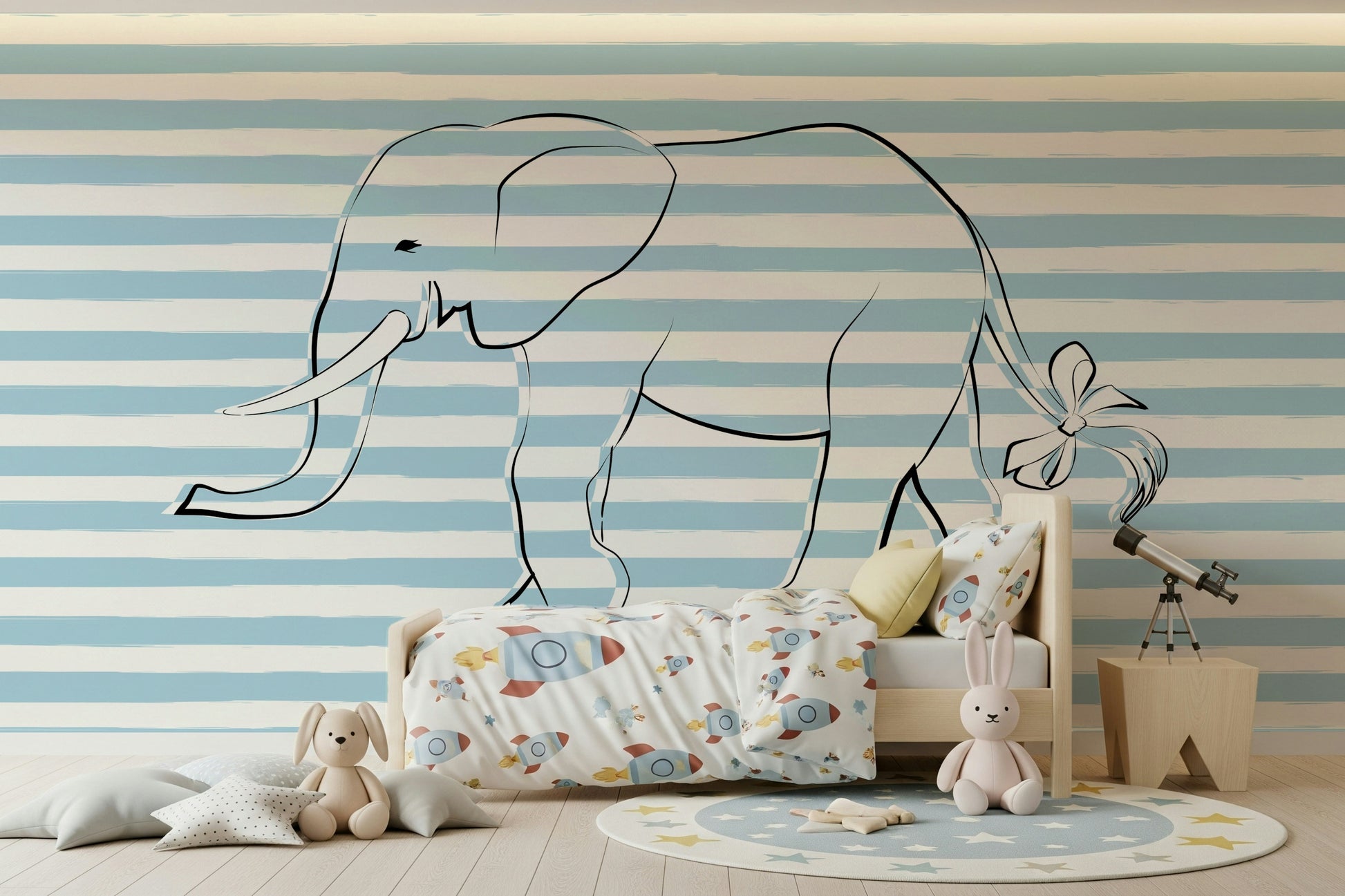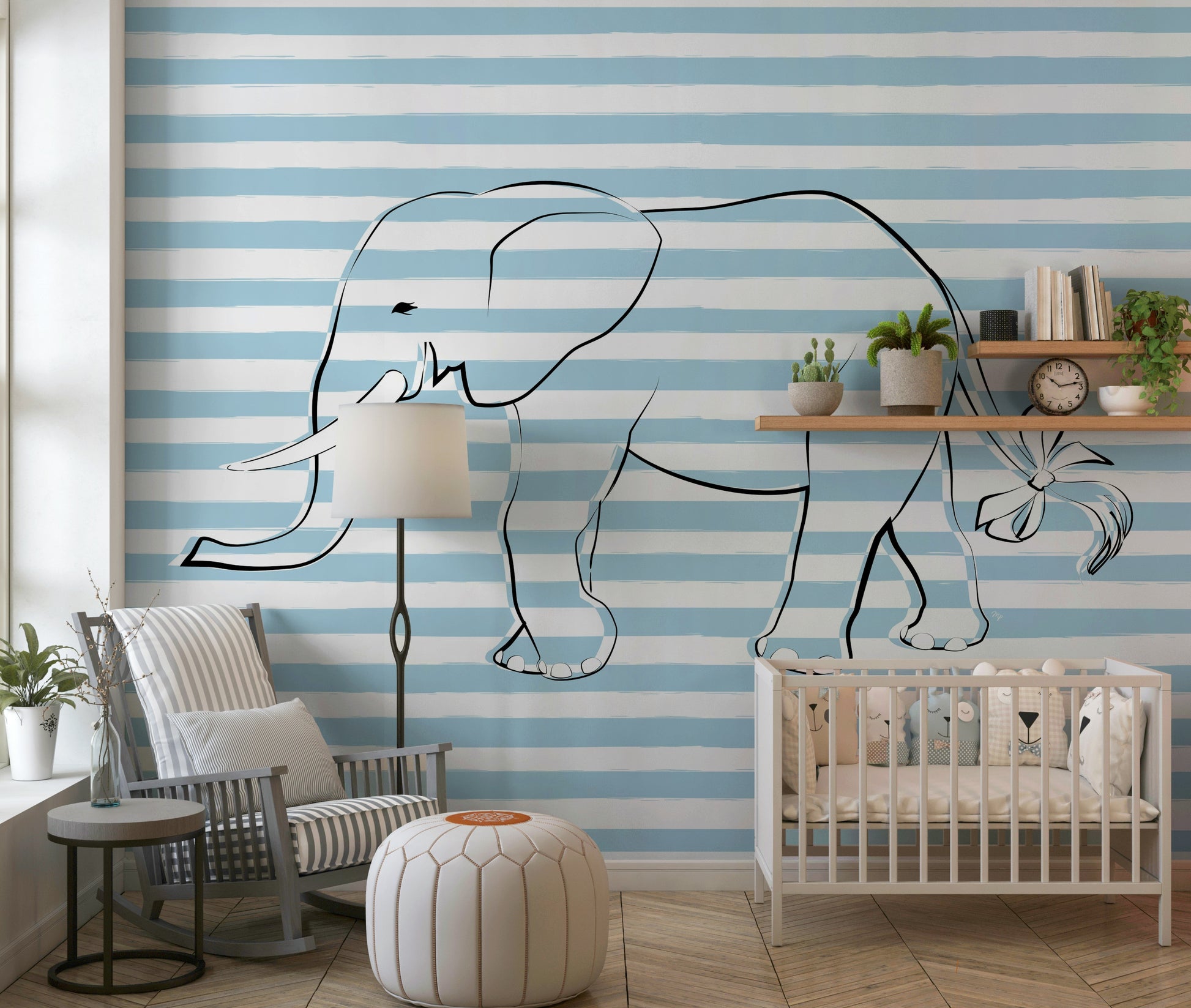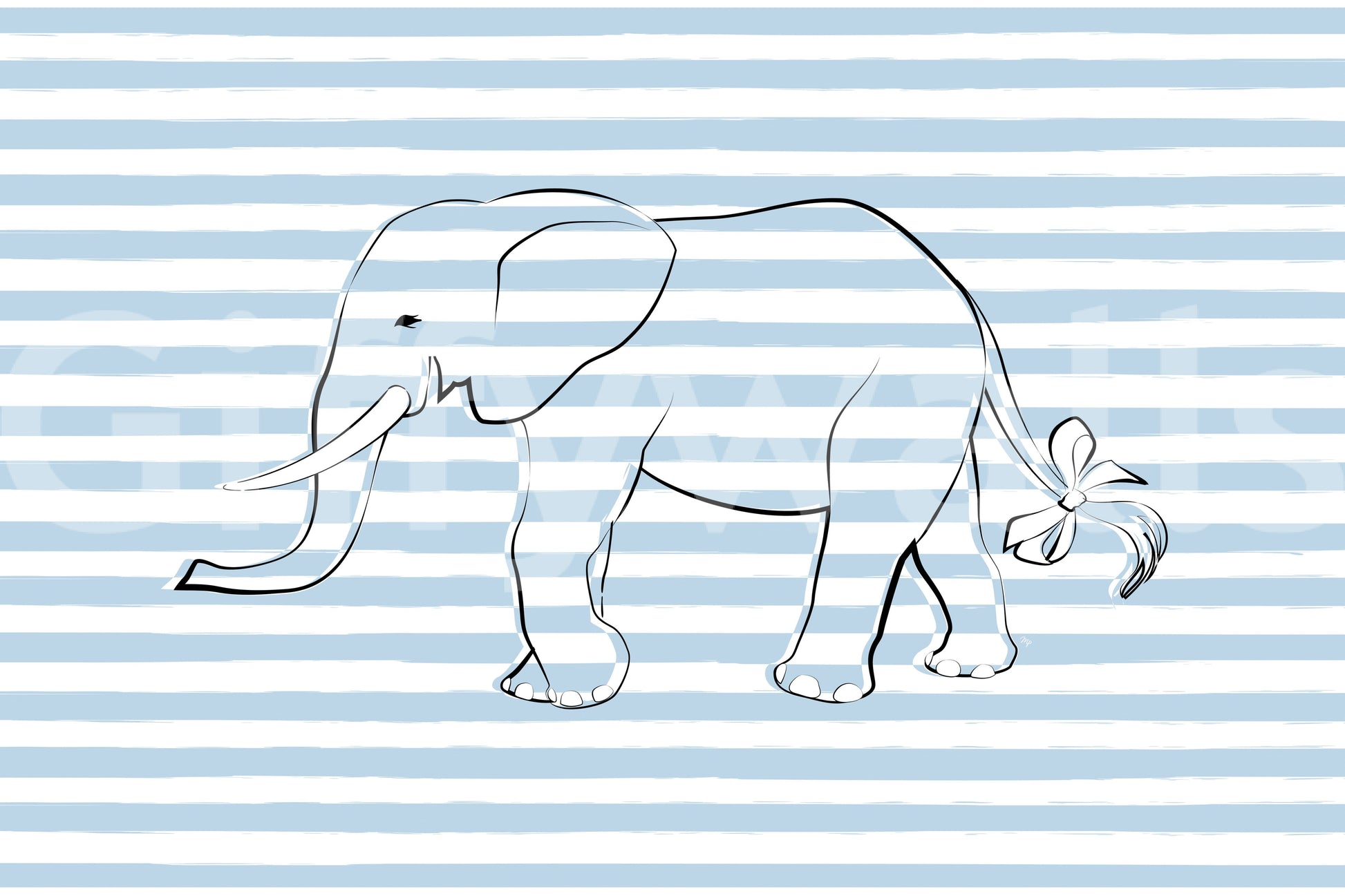 Bring a touch of whimsical charm to your space with this delightful wallpaper. The design shows a simple outline of an elephant, complete with a sweet bow on its tail, set against a background of light blue and white stripes. It offers a simple yet effective way to decorate. Ideal for a baby's room or a kid’s bedroom, this wallpaper for walls creates a soothing and happy environment. The clean lines and gentle colors coordinate beautifully with various decor styles.