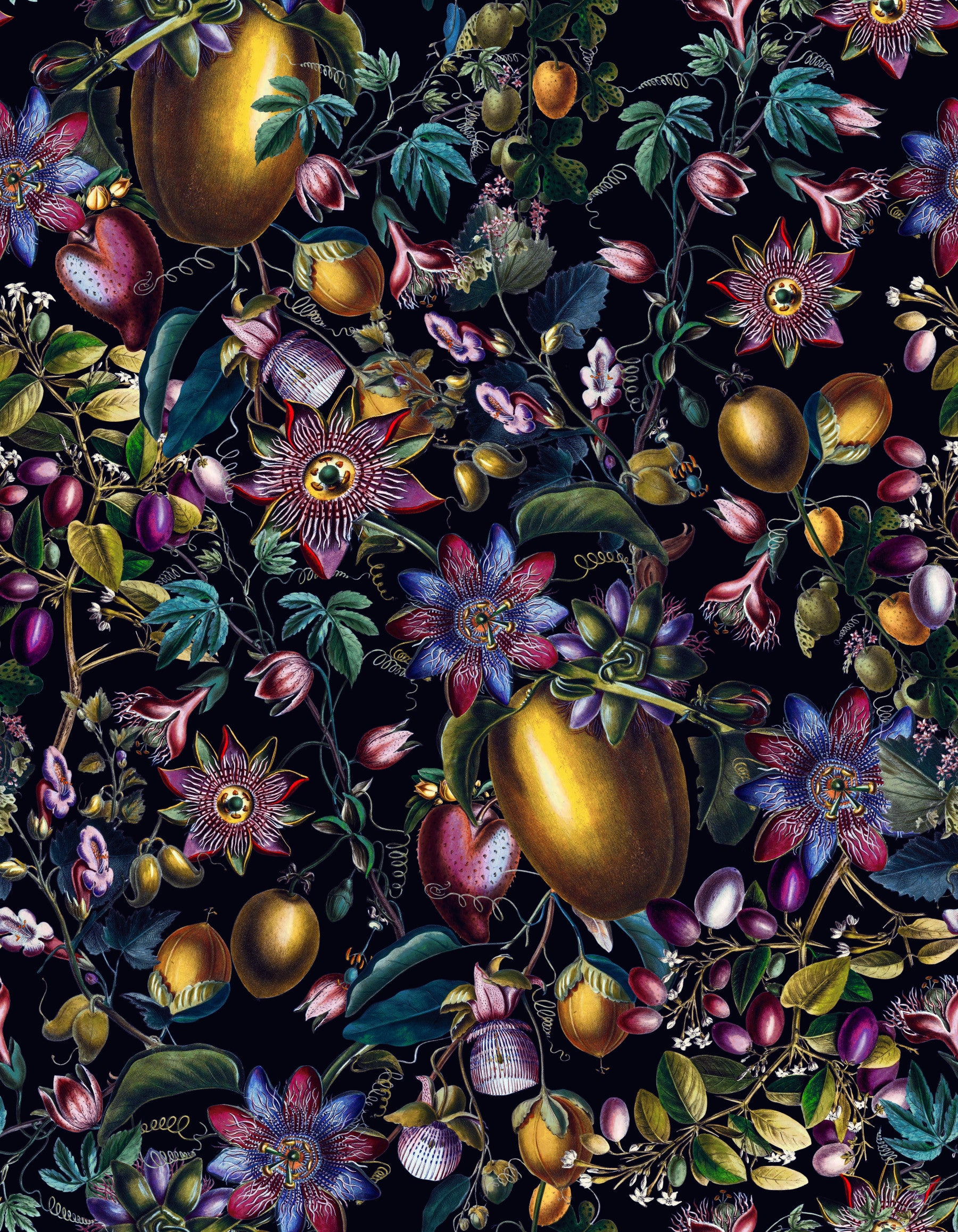 Escape to a world of fantasy with 'Enchanted Garden,' a wallpaper design that brings the magic of a hidden paradise to your walls. The design showcases a lush tapestry of intricately detailed passion flowers, exotic fruits, and vibrant foliage, all rendered in a palette of deep, rich jewel tones against a captivating black backdrop. This wallpaper is more than just decoration; it's an invitation to dream. Its intricate details and vibrant colours create a captivating and sophisticated atmosphere, transforming any room into a haven of enchanting beauty and timeless elegance. Perfect for those seeking a touch of magic and wonder in their home.