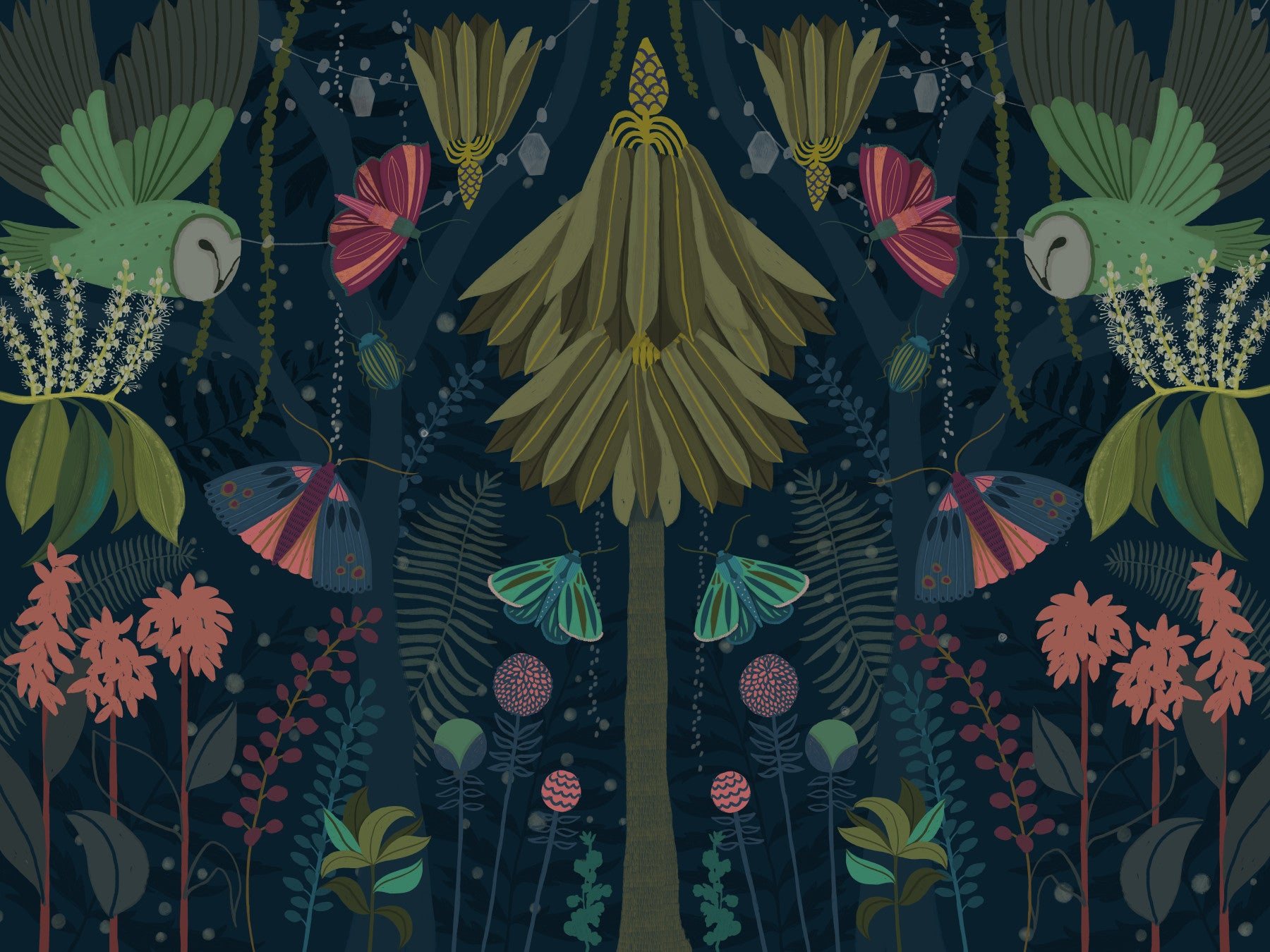 Enchanted night garden mural with lush foliage and peaceful vibes.