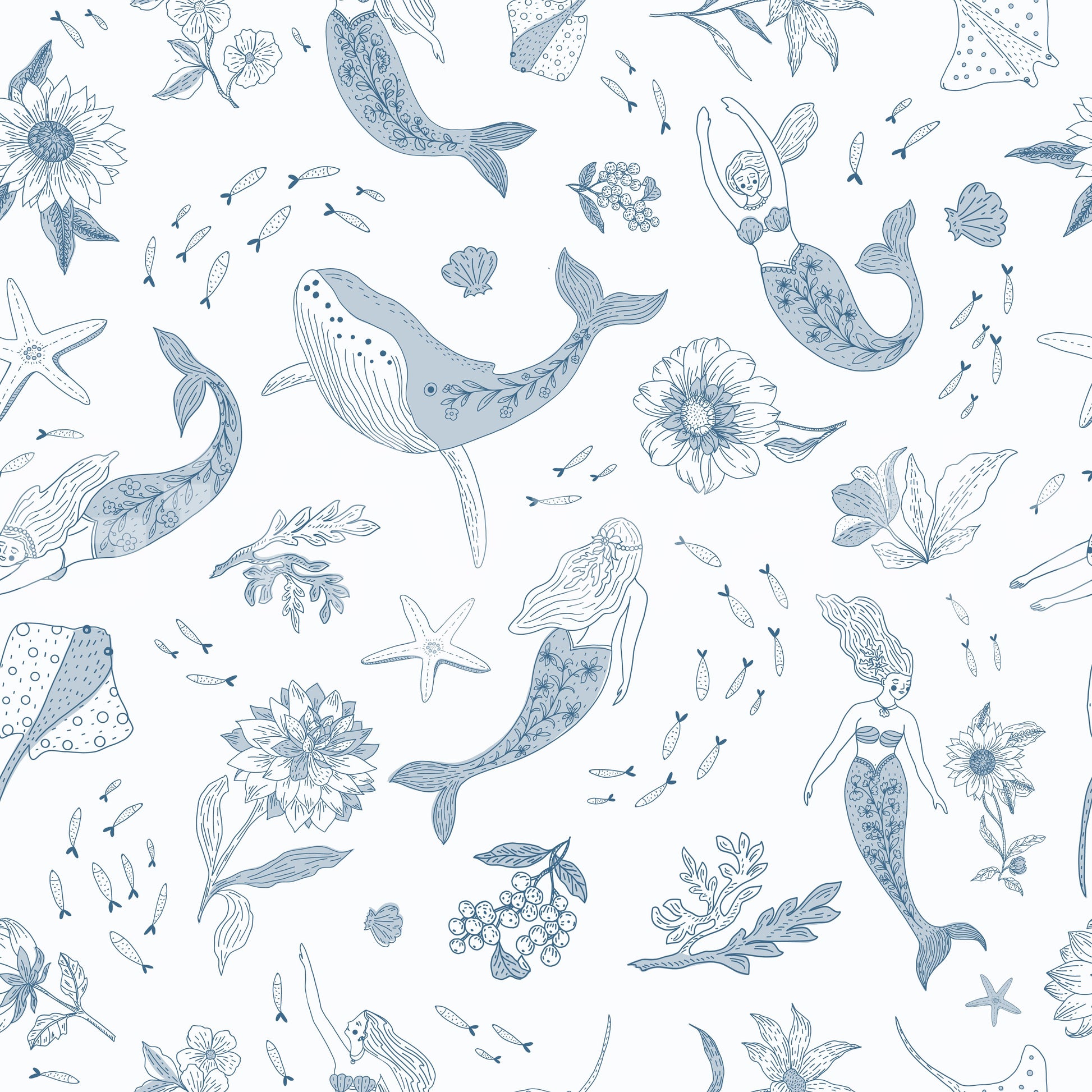 Dive into a world of serene enchantment with this whimsical wallpaper. Delicate line art depicts graceful mermaids adorned with floral details, swimming alongside whales and stingrays. Subtle blue hues on a soft white background create a calming atmosphere, perfect for a bedroom or nursery. The intricate details and charming sea creatures evoke a sense of wonder and tranquility, transforming any space into an underwater paradise. This design is perfect for adding a touch of dreamy elegance to your home.