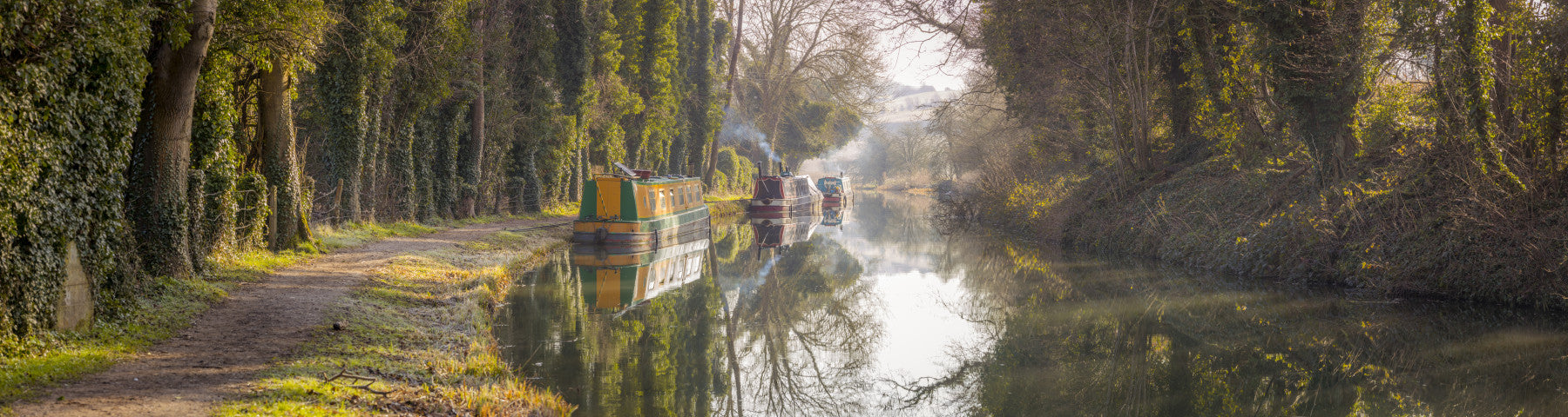 Escape to the English countryside with this idyllic wallpaper. The image showcases a picturesque canal, lined with lush greenery and majestic trees. Narrowboats gently float on the calm water, adding a touch of rustic charm. The soft light and gentle mist create a dreamy, almost ethereal atmosphere. Perfect for a bedroom or any space where you want to evoke a sense of tranquility and peaceful escape.