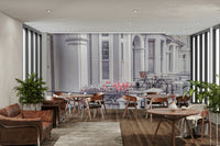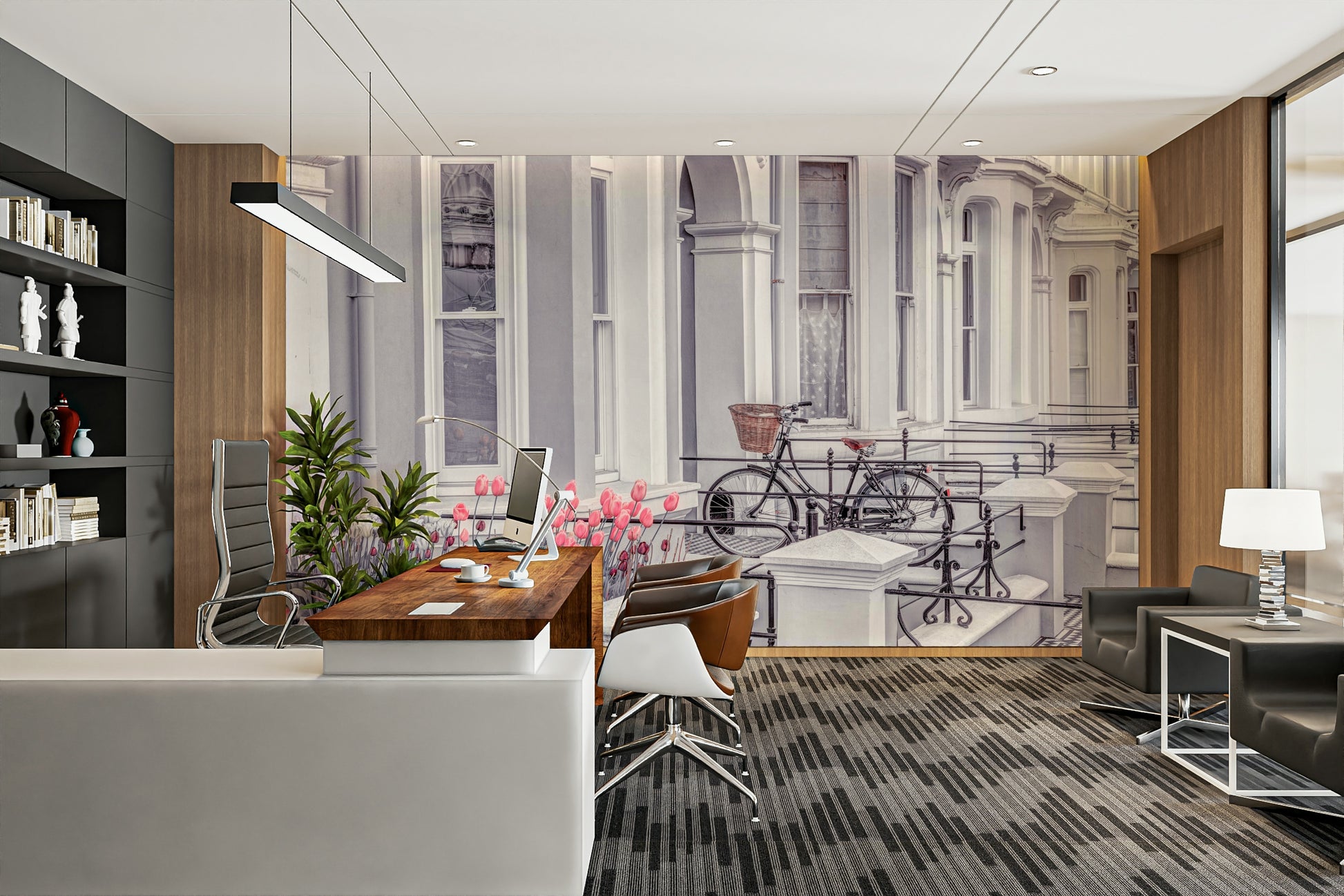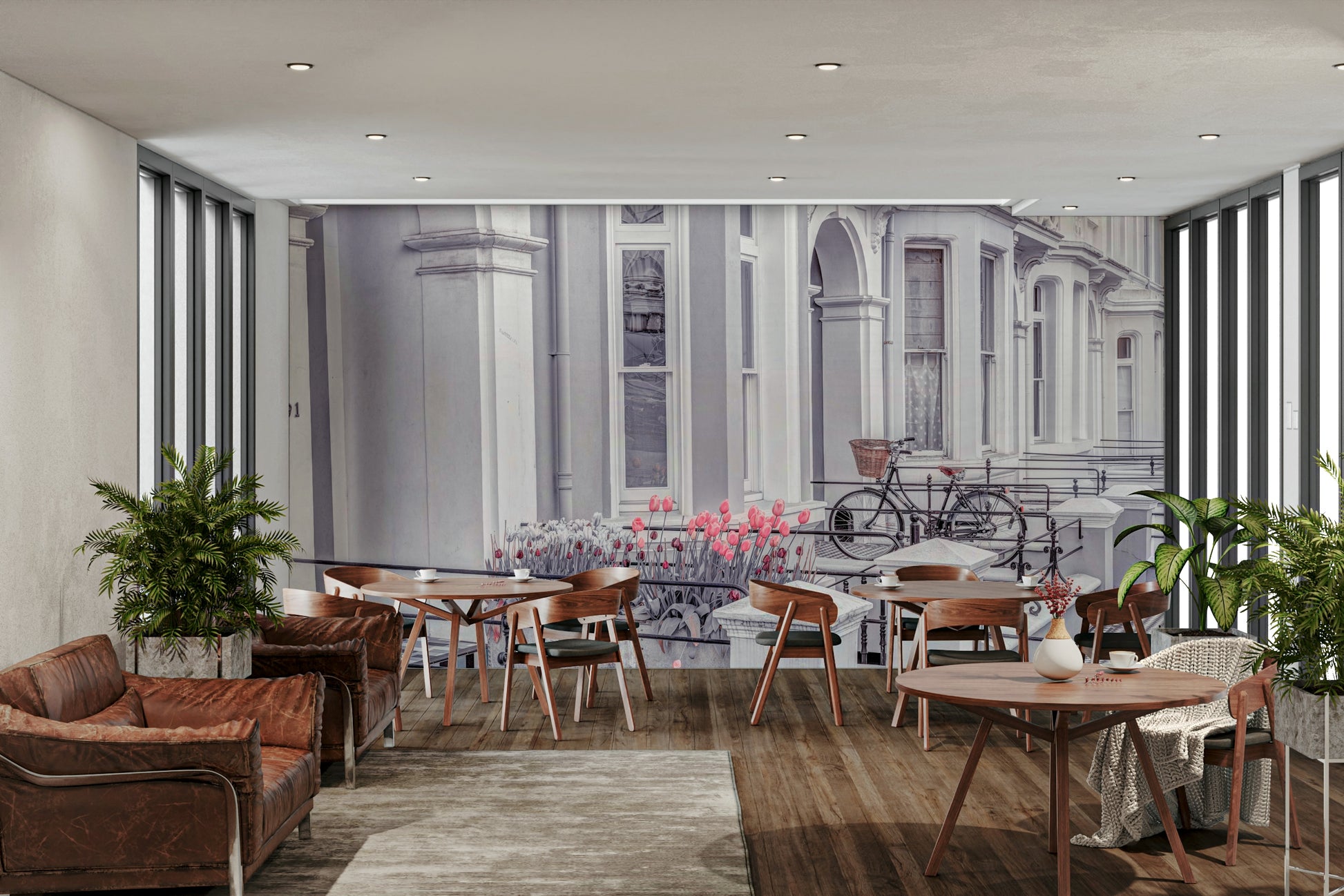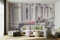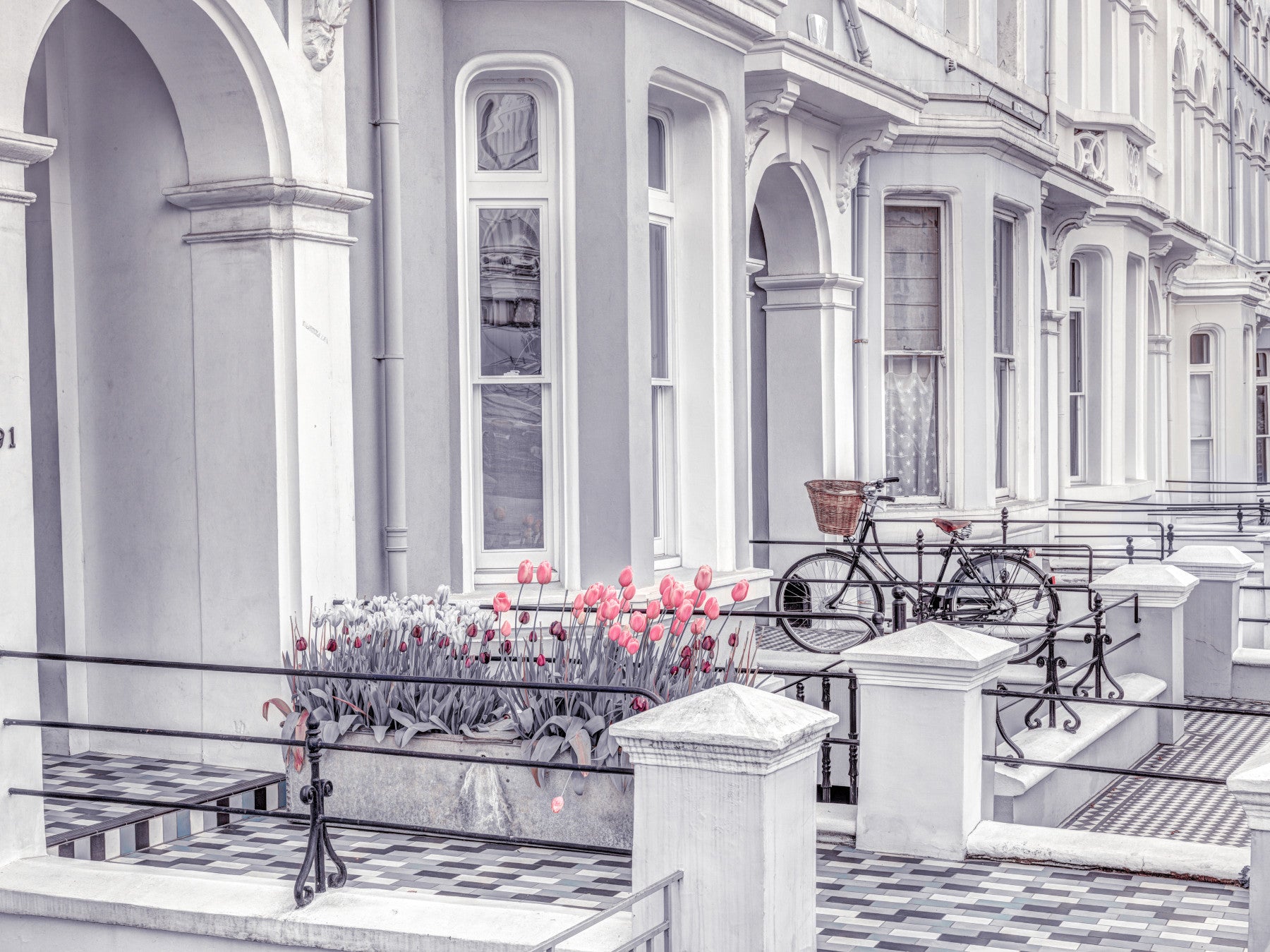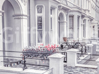 Colorful english houses facades in Notting Hill, London. Bring subtle charm to your home with this wallpaper for walls featuring an elegant row of London townhouses. The architectural details, soft color palette, and the bicycle add a touch of life. It has a timeless style. The design works great in a living room or hallway. It brings elegance and serenity to a space.