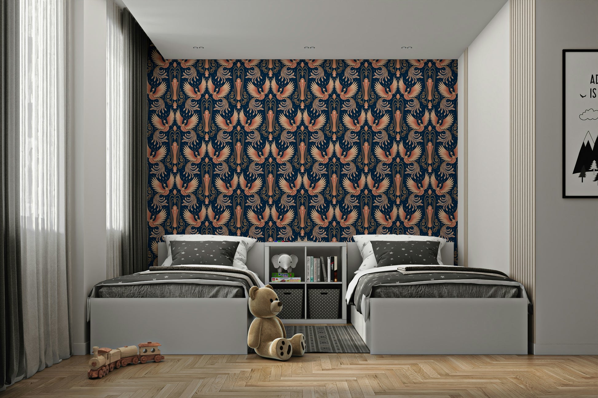 Experience the timeless beauty of the phoenix with this breathtaking wallpaper. The design features majestic phoenixes rendered in soft coral and rose gold hues, their wings spread in an eternal flight. The elegant Art Deco-inspired pattern, with its flowing lines and intricate details, creates a sense of both luxury and movement. The dark navy backdrop enhances the richness of the phoenixes and the metallic accents, adding a touch of mystery and sophistication. This wallpaper is perfect for creating a dramatic and visually captivating atmosphere in any space.