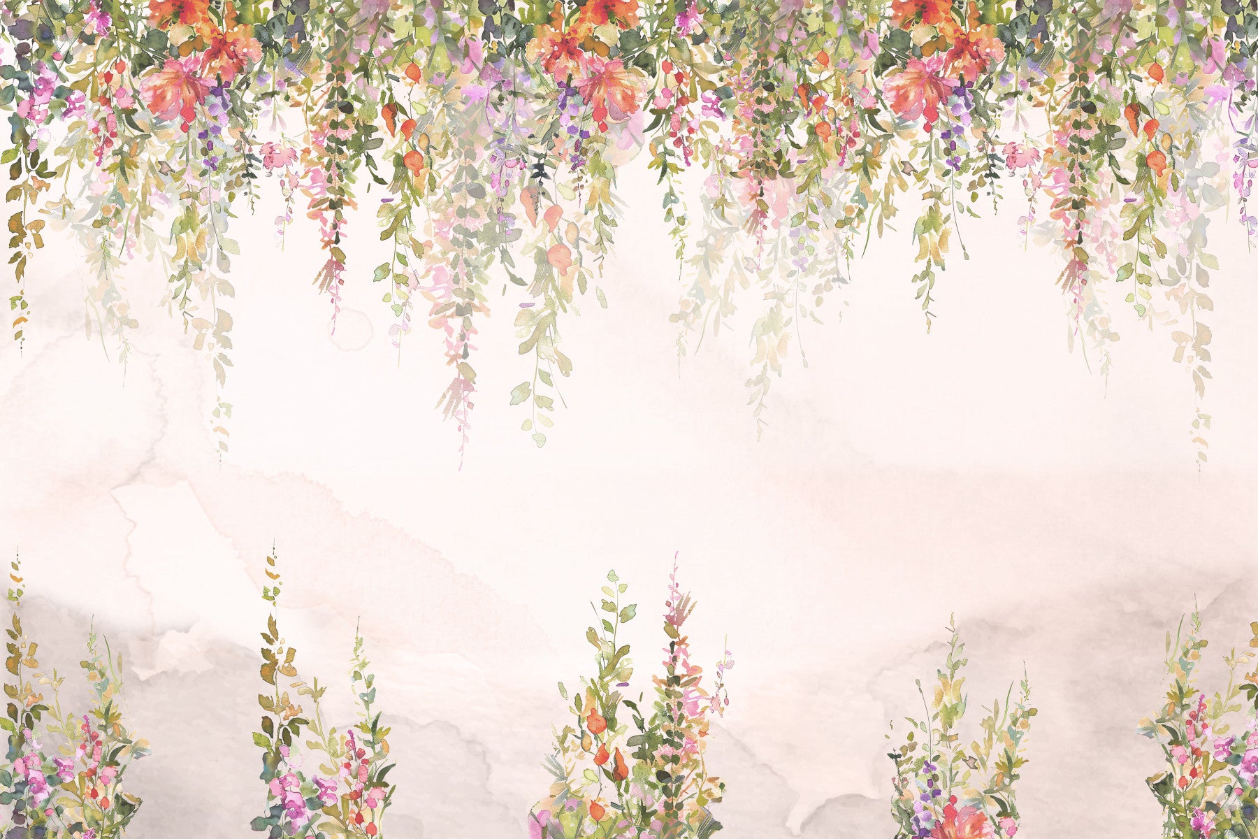 Create a soothing sanctuary with this ethereal floral design, perfect as wallpaper for walls. This design features delicate watercolor flowers in soft pinks, greens, and purples gently cascading down. The subtle background adds depth without overpowering the delicate blooms. Enliven bedrooms, nurseries, or living areas with its tranquil charm. Its light, airy style seamlessly complements a variety of decors, creating a space of calming beauty that elevates the interior environment.
