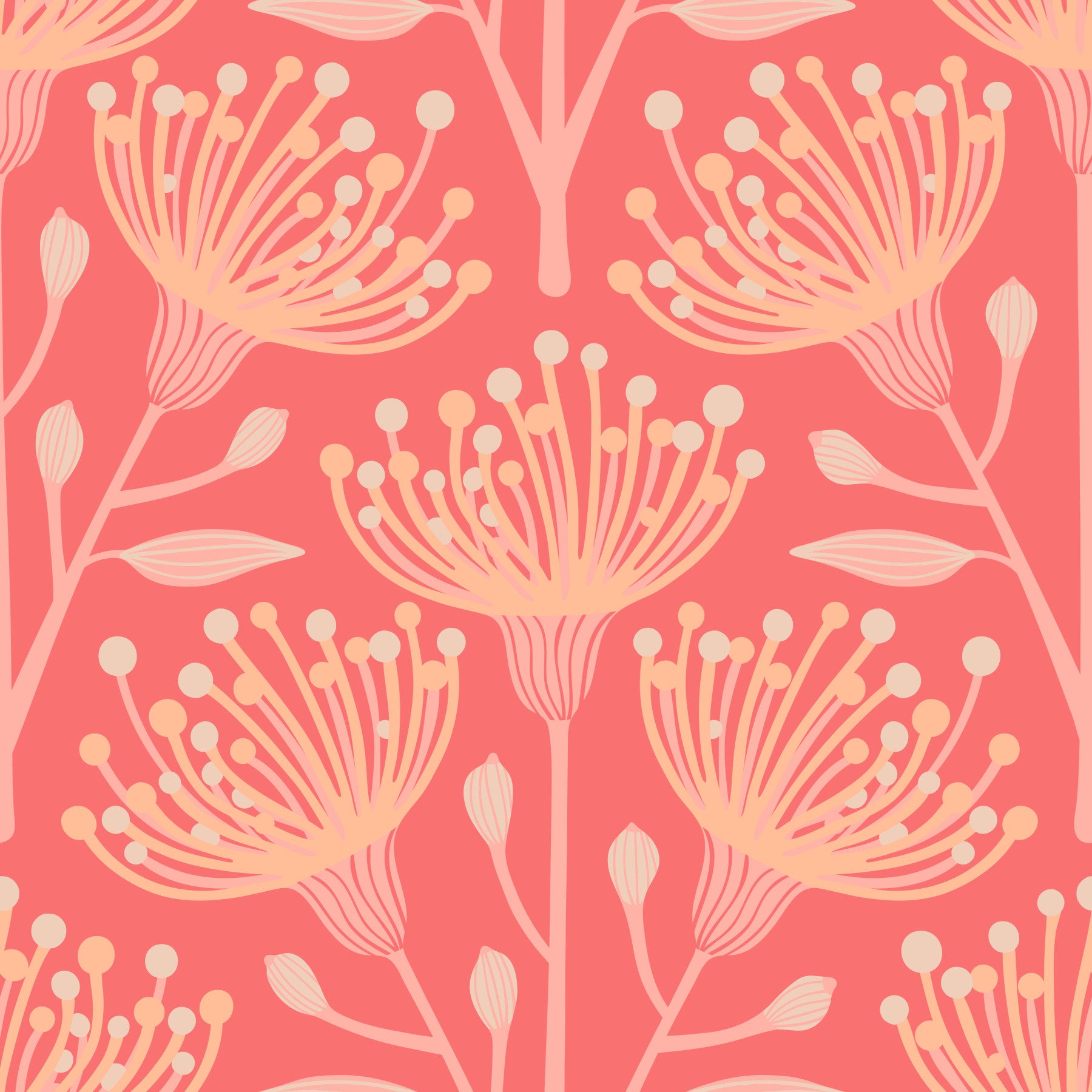 Immerse yourself in the captivating allure of our Eucalyptus Floral Botanical Wallpaper in Bright Peach Fuzz Orange. This design showcases a harmonious blend of botanical elegance and modern artistry, featuring stylized eucalyptus flowers in a delightful palette of Peach Fuzz Orange and Apricot on a bright Orange background. The repeating pattern creates a visually soothing and subtly vibrant atmosphere, perfect for adding a touch of warmth and sophistication to any space. The clean lines and simplified forms of the floral motifs lend a contemporary feel, while the gentle color scheme evokes a sense of calm and serenity. This wallpaper is an ideal choice for those seeking to create a stylish and inviting environment that celebrates the beauty of nature with a modern twist. This pattern design is also available in Other Colourways too! Original wallpaper pattern design by Jackie Tahara of UnBlink Studio.