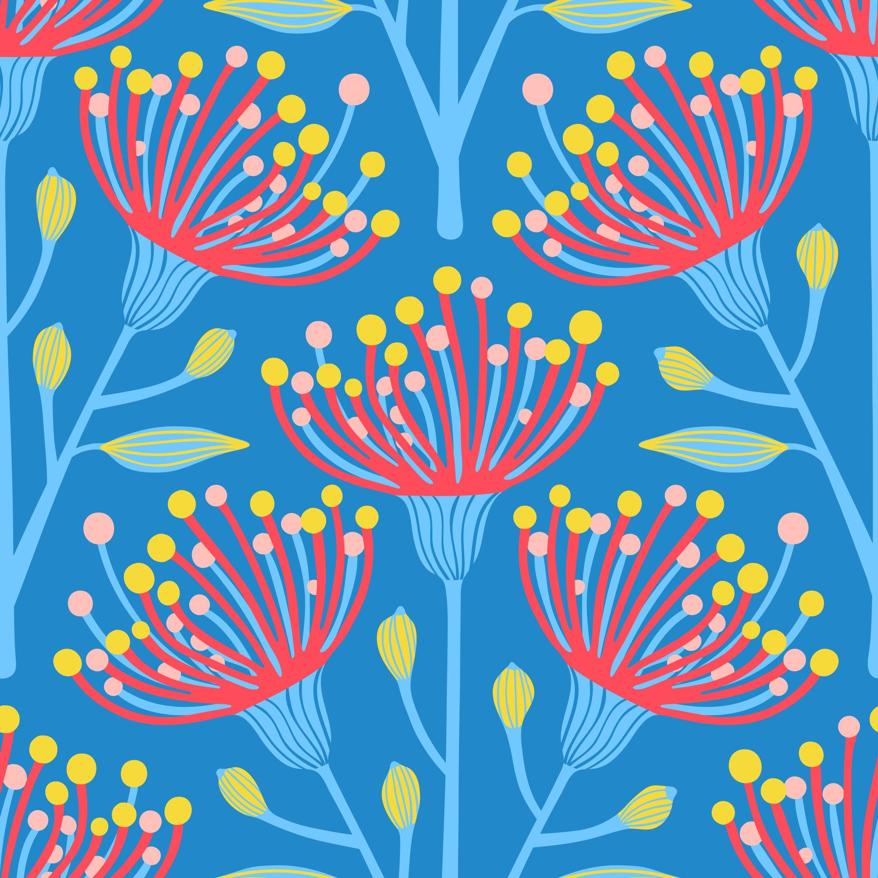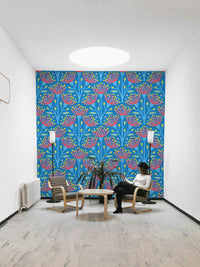 Immerse yourself in the vibrant energy of this striking "Eucalyptus" floral botanical wallpaper that bursts with life against a bright blue backdrop. This botanical pattern features stylized eucalyptus blooms in a captivating mix of light icy blue, bold red, cheerful yellow, and delicate pink hues. The interplay of colors creates a visually stunning and uplifting atmosphere, perfect for adding a touch of modern artistry to any space, and wonderful for those looking to introduce a burst of color and character into their homes. This meticulously crafted botanical pattern offers a playful yet sophisticated charm. This pattern design is also available in Other Colourways too! Original wallpaper pattern design by Jackie Tahara of UnBlink Studio.