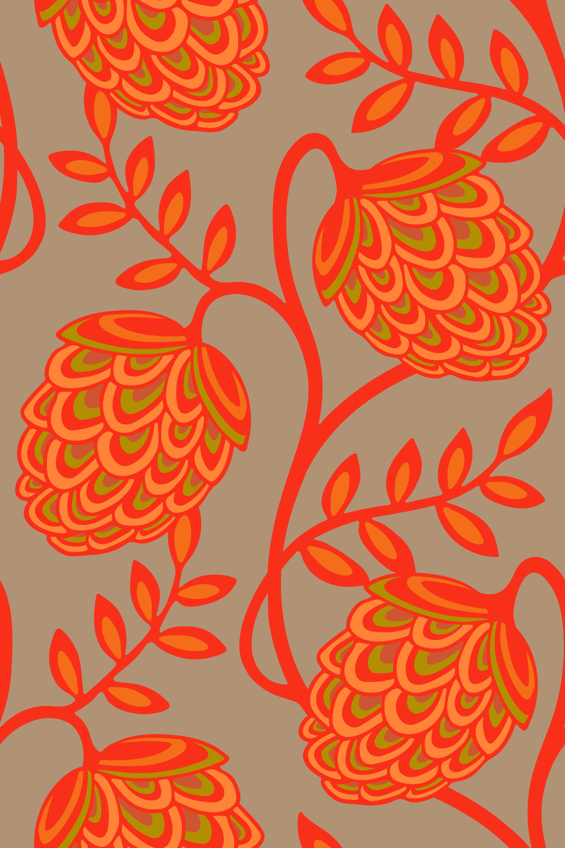 Immerse yourself in the enchanting allure of Fantasia a wallpaper design that seamlessly blends botanical wonder with modern Art Nouveau flair. This organic design features stylized flower vines and leaves crafted with a gentle, curving aesthetic that is a modern twist on classic Art Nouveau style. The bright vibrant palette of coral, light orange and green on warm beige creates a fun and colorful ambiance, perfect for bedrooms, living rooms, or any space needing a pop of bright energy. This pattern design is also available in Other Colourways too! Original wallpaper pattern design by Jackie Tahara of UnBlink Studio.
