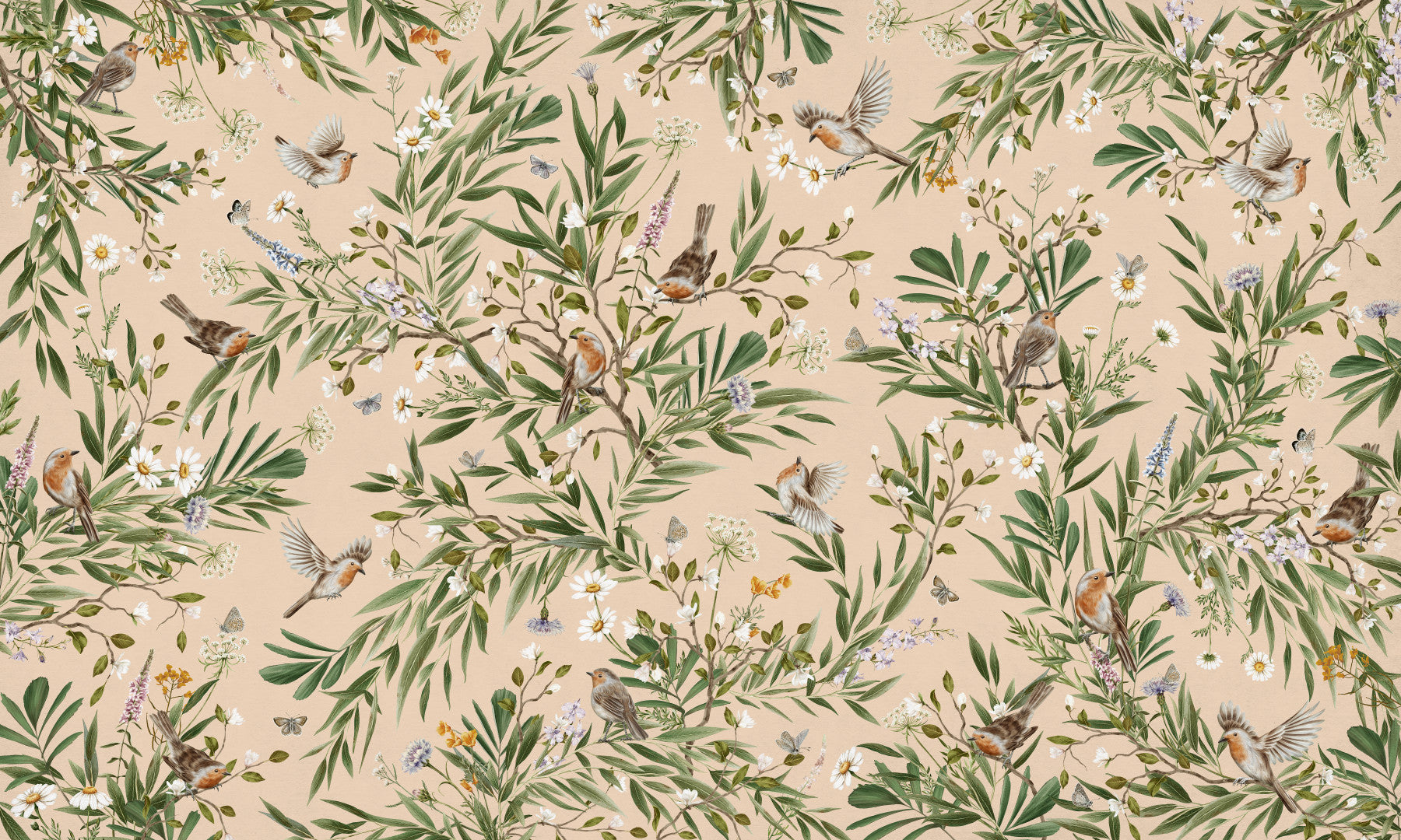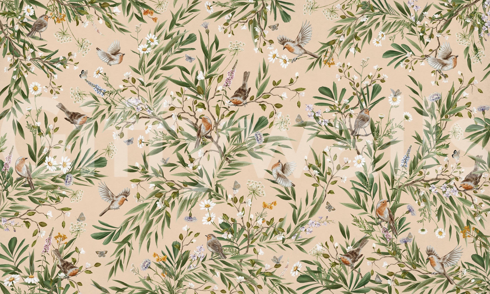 Transform your space with this delicate botanical design. Sweet robins interact with soft, trailing foliage on a warm background. This wallpaper for walls lends a touch of nature's elegance to your home. It enhances bedrooms and living rooms with its relaxing ambiance. The charming illustration style adds a unique flair. Its soft colors and intricate details make it an excellent choice to create a tranquil and uplifting atmosphere. Imagine enjoying a calm oasis in your own home.